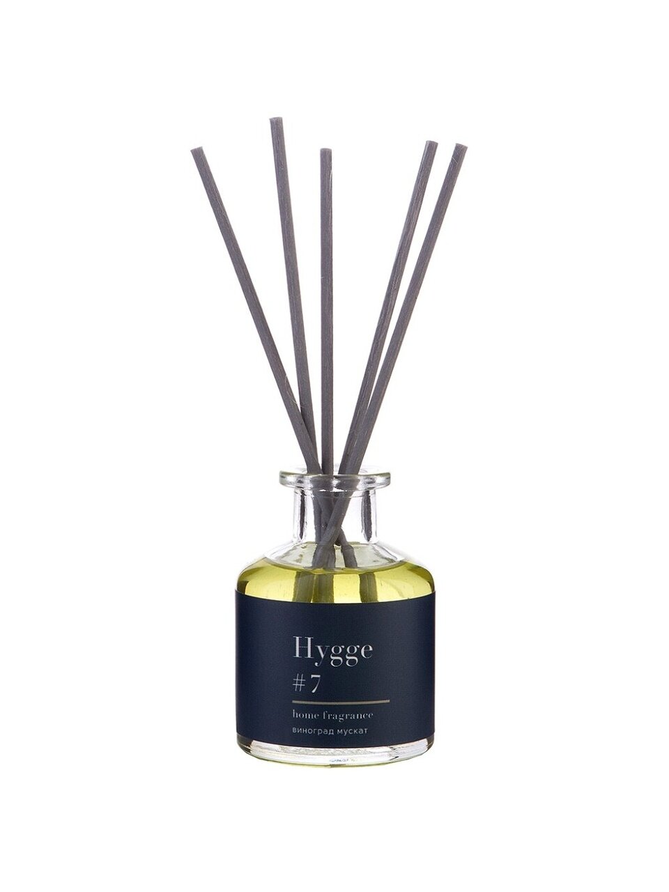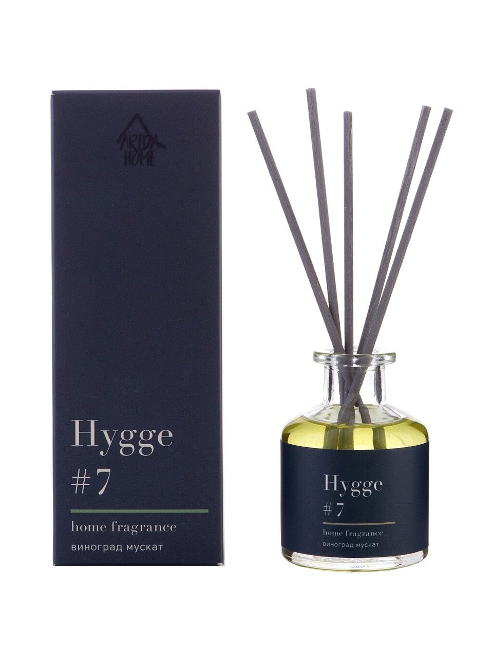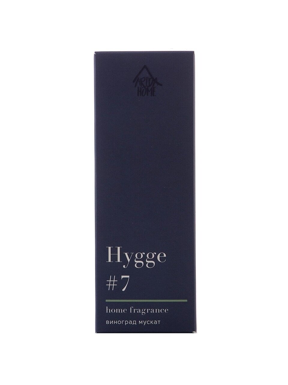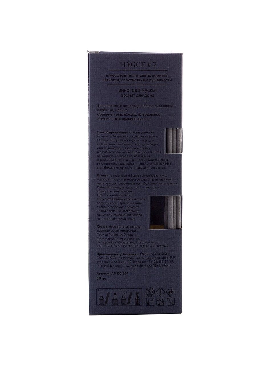 Аромадиффузор с палочками Arida Home Hygge #7 Виноград мускат — это безопасный экологически чистый и натуральный способ ароматизации помещения, является прекрасной альтернативой ароматизированным спреям. Стильный дизайн этого модного ароматического аксессуара украсит любой интерьер. Диффузор представляет собою изящную стеклянную емкость с ароматной жидкостью. В нее вставляются несколько длинных фибровых палочек. Постепенно, насыщаясь эфирными маслами, они распространяют аромат по всей комнате. Палочки важно применять сразу все и периодически переворачивать (1–2 раза в сутки). Флакона объемом 50 мл хватит на помещение площадью до 15 кв.м. Срок службы диффузора от 1,5 до 2 -х месяцев, в зависимости от места использования. В более влажных помещениях, срок использования сокращается.