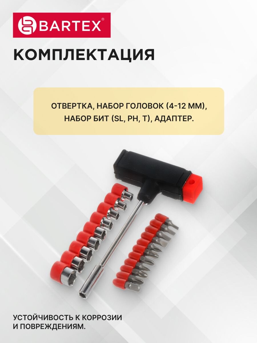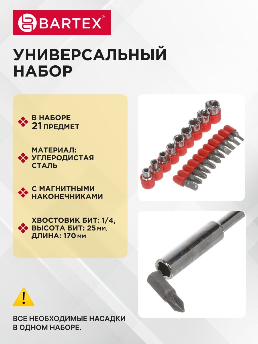 Набор отверток с битами Bartex — идеальный выбор для дома и дачи. Универсальный комплект из 21 предмета с прочными битами SL, PH, T и Т-образной ручкой из пластика обеспечивает удобство работы с различными крепежами. Магнитные свойства ускоряют процесс, а сталь гарантирует долговечность. Практичная упаковка-блистер удобна для хранения. Получите надежный инструмент для любых задач по выгодной цене!