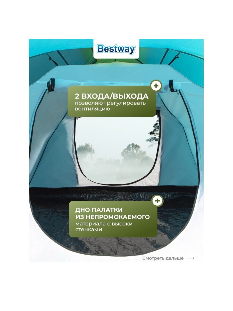 - Два выхода не только обеспечивают удобный доступ к палатке, но и позволяет регулировать вентиляцию.
