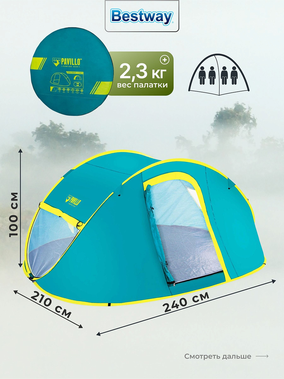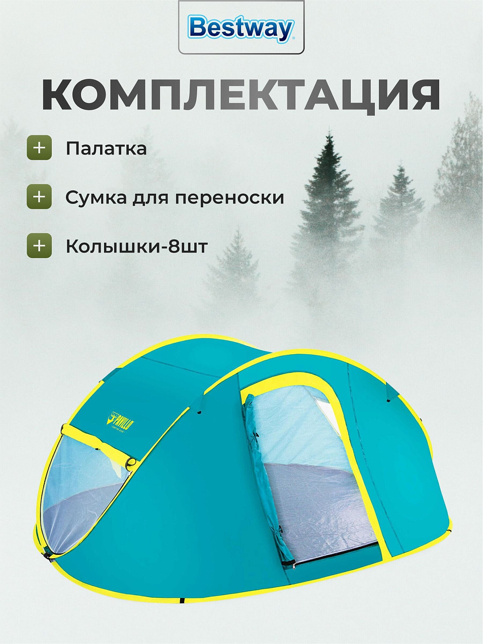 - Обтекаемая структура палатки обеспечивает устойчивость при ветре;