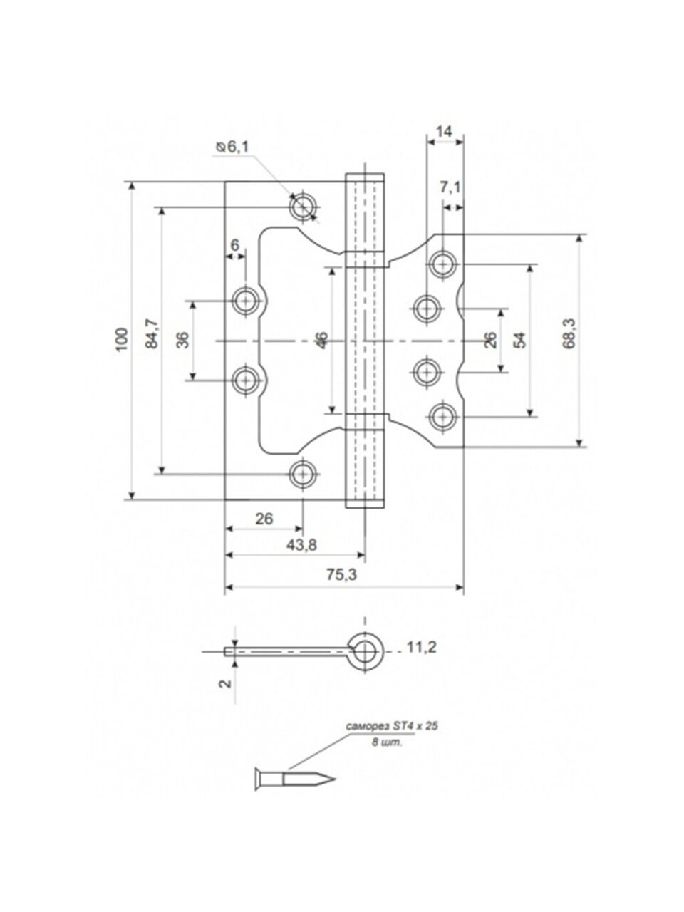 Дверная петля без врезки "Vanger" 100*75*2-P2-CR с 2-мя подшипниками. Материал - сталь. Размеры петли: 100х75 мм, толщина карты 2 мм. Цвет: хром
