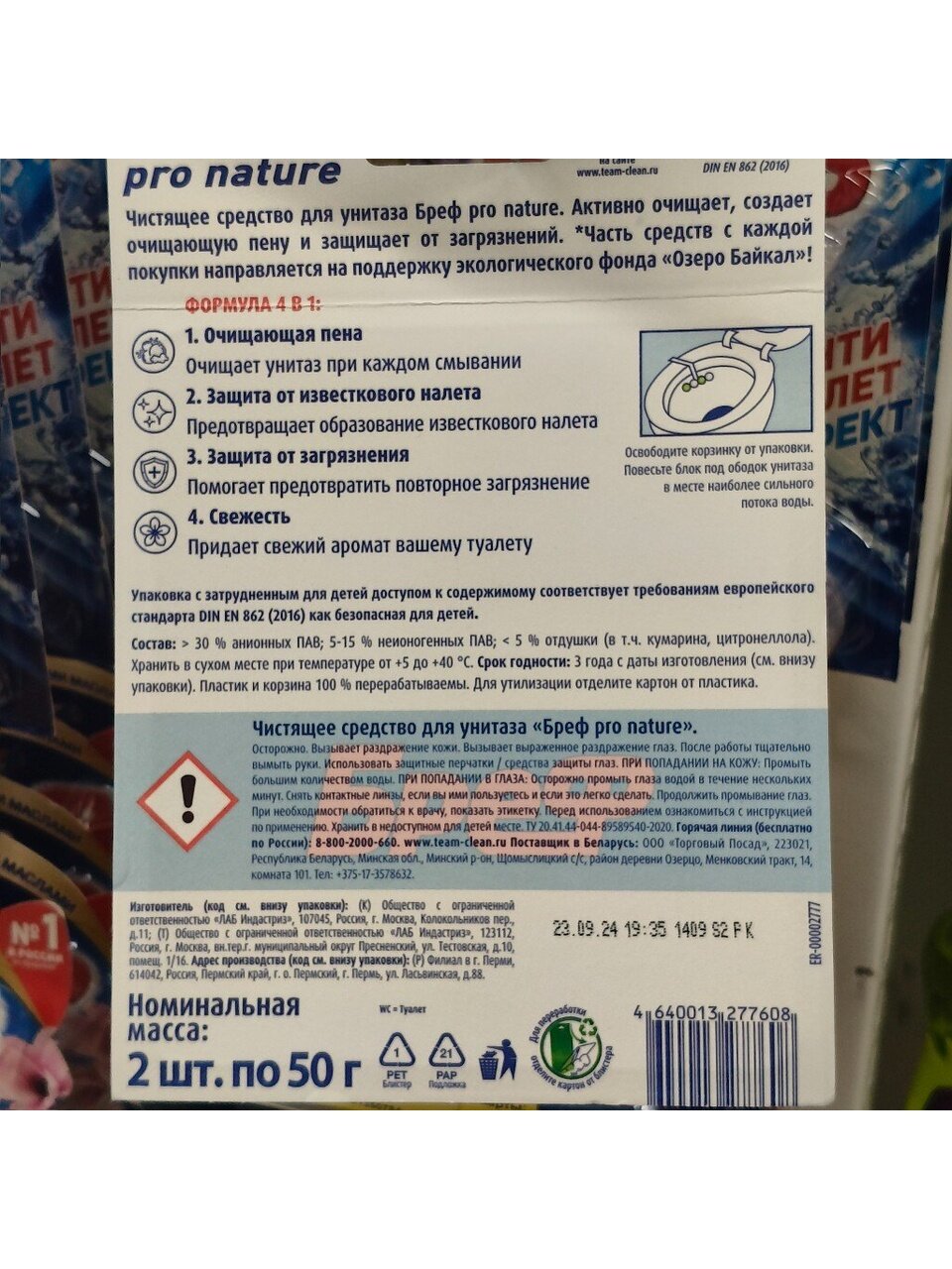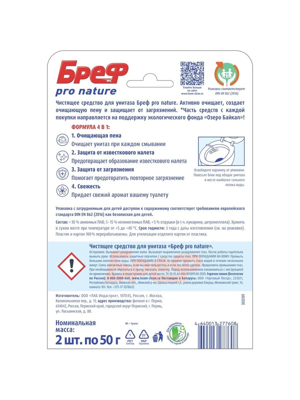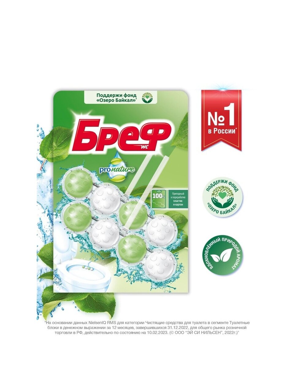 Подвеска для унитаза Бреф Pro Nature — это туалетный блок, который активно очищает и защищает от загрязнений. Создает видимый результат при каждом смывании. Упаковка на 100% пригодна для дальнейшей переработки пластика и картона.