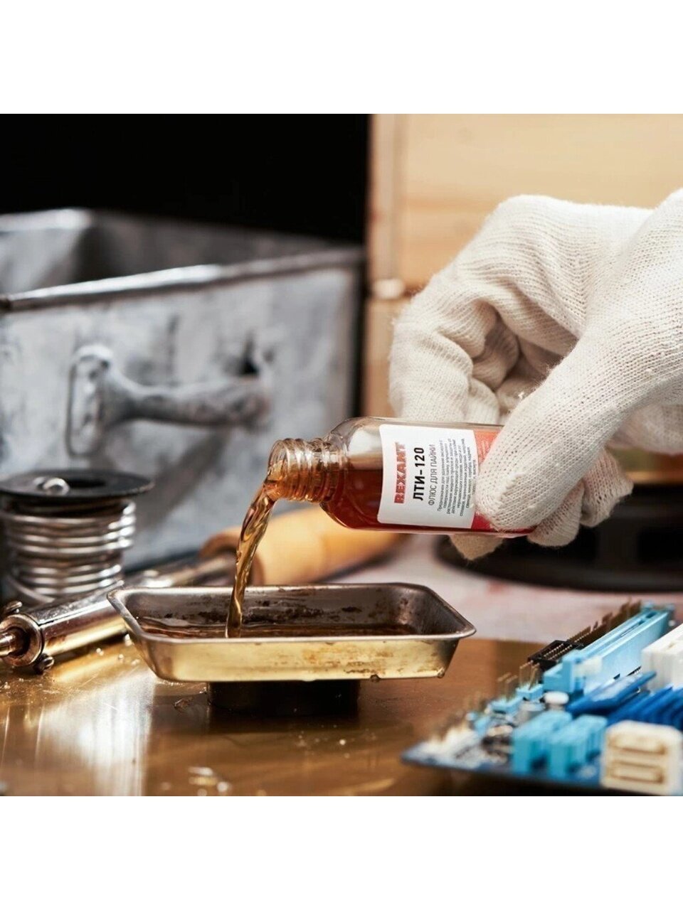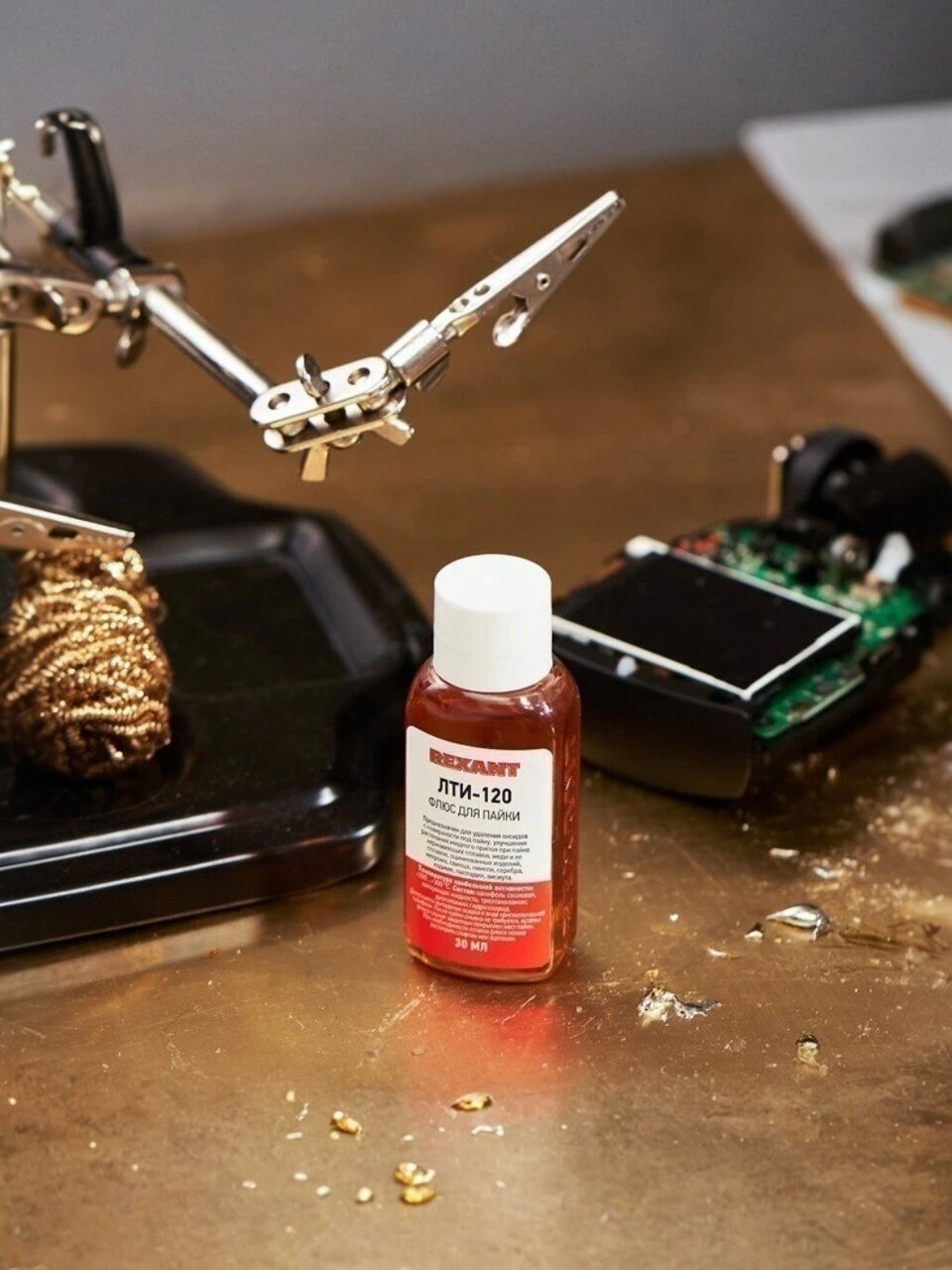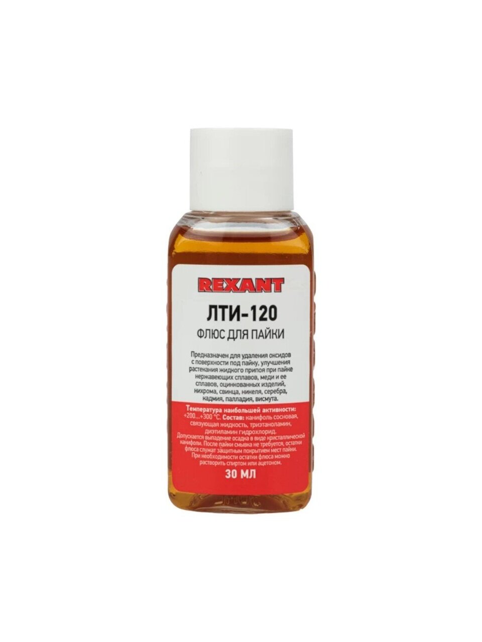 Флюс для пайки REXANT ЛТИ-120, 30мл — идеальный выбор для качественной пайки печатных плат и радиоаппаратуры. Не проводит ток, не требует отмывки после пайки, эффективно удаляет оксиды с поверхности. Состав: канифоль сосновая, связующая жидкость, триэтаноламин, диэтиламин гидрохлорид. Температура наибольшей активности: +200...+300°С. Применяется для создания надежных и чистых соединений.