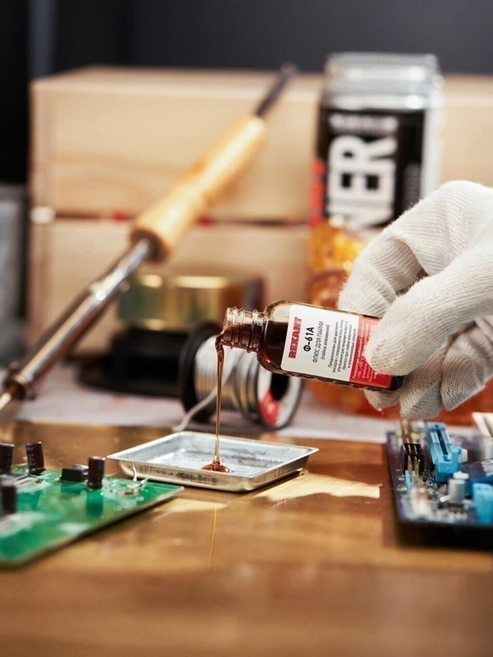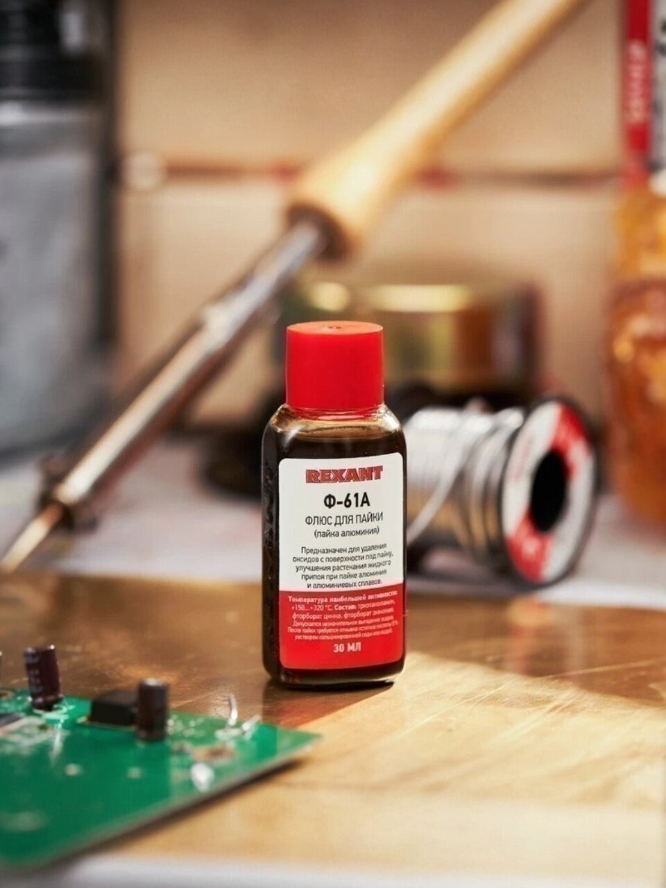 Флюс для пайки REXANT, Пайка алюминия, 30 мл — надежное решение для качественного соединения алюминия и алюминиевых сплавов с медью и сталью. Обеспечивает прочное сцепление при пайке припоями на основе олова, цинка или цинка и кадмия. После пайки остатки легко смываются водой или 5% раствором кальцинированной соды. Температура активности +150...+320°С. Состав: триэтаноламин, фторборат цинк и фторборат аммоний.