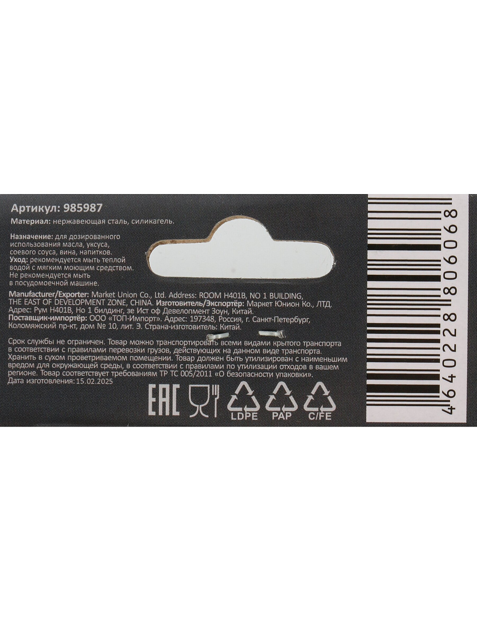 Длина изделия — 11 см, подходит для стандартных бутылок с маслом, уксусом, алкоголем. Материал — пищевой пластик и металл.