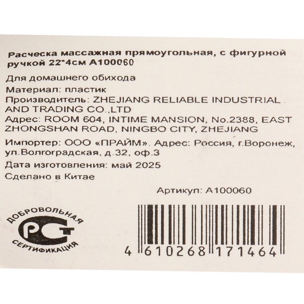 Расческа массажная, 22х4 см, прямоуг, с фигурной ручкой, A100059