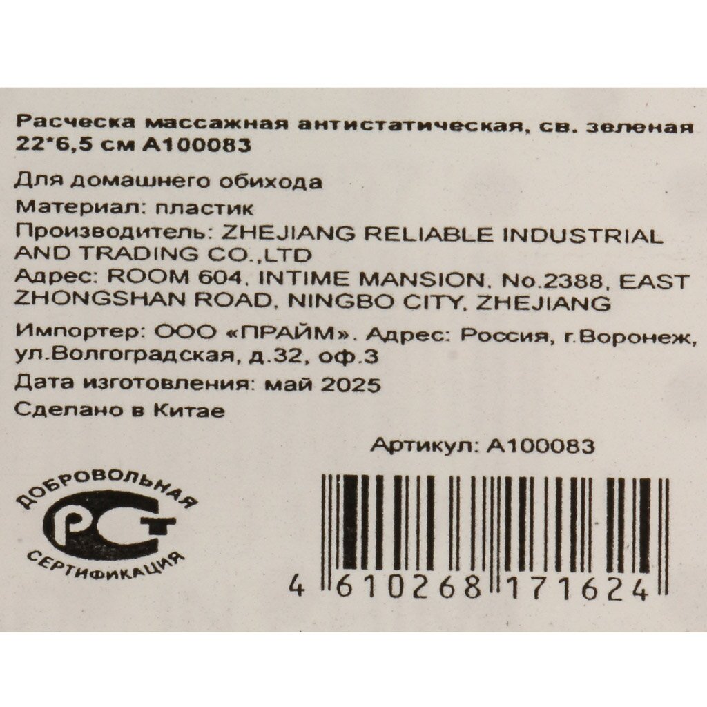 Расческа массажная, 22х6.5 см, антистат, св. зел, A100083