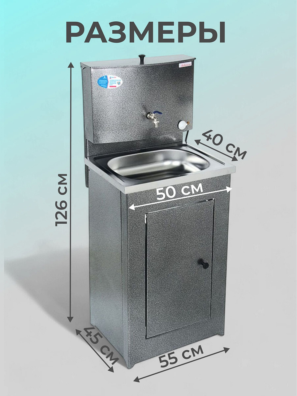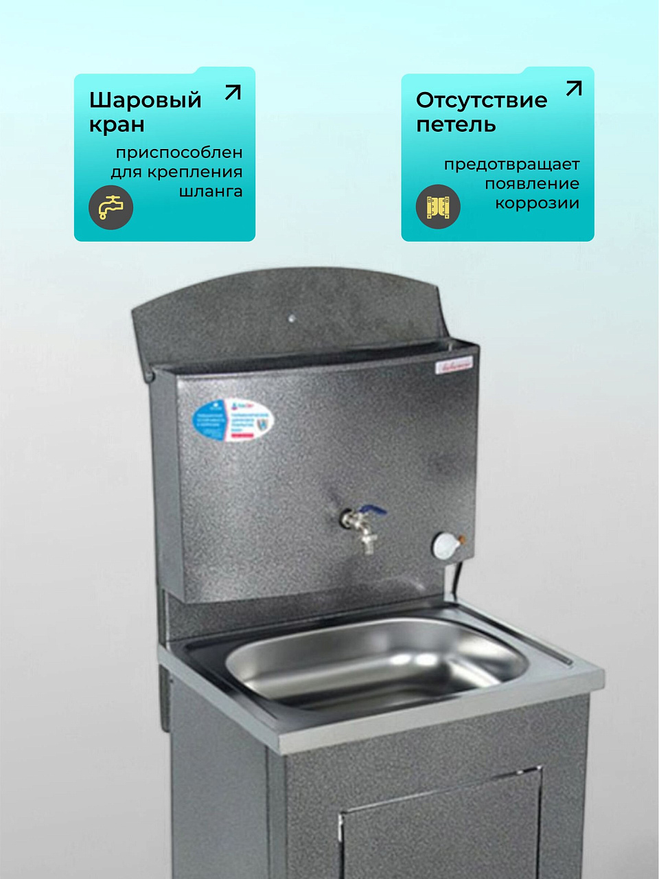 Конструкция умывальника сборная, состоит из бака с металлическим шаровым краном и тумбы, которая незаметно скрывает способ отлива воды и позволяет монтировать отвод воды как в закрытую емкость, так и в канализацию. Бак внутри обработан запатентованным противокоррозийным покрытием, которое гарантирует долговечность продукции и исключает возникновение ржавчины.