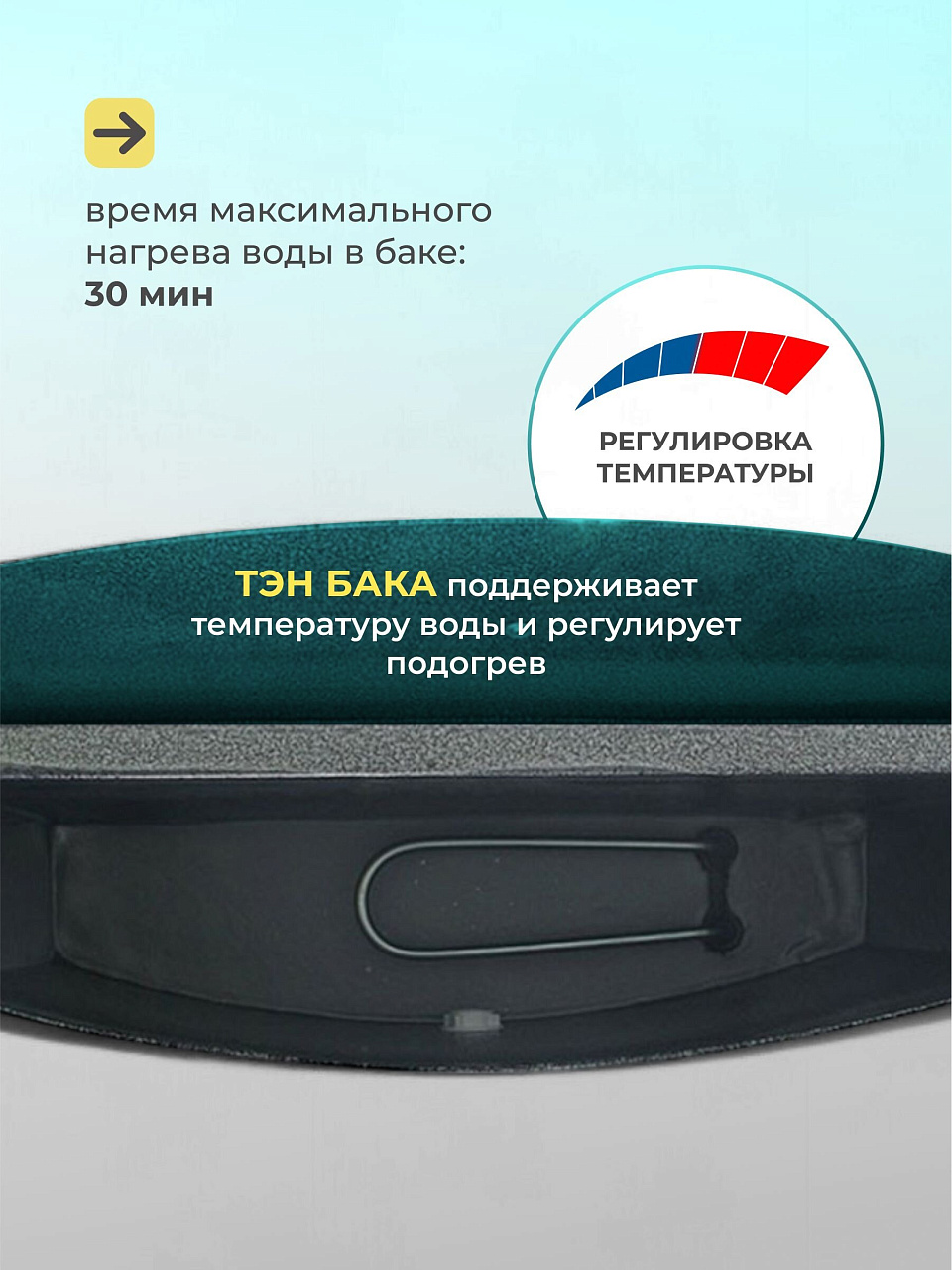 - Время максимального нагрева воды в баке: 30 мин.