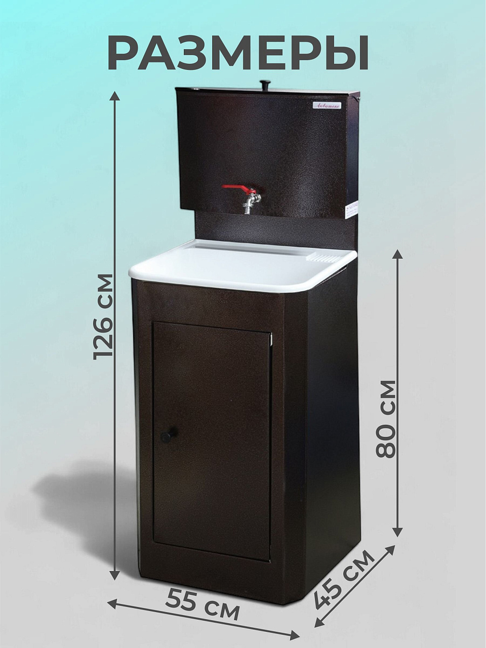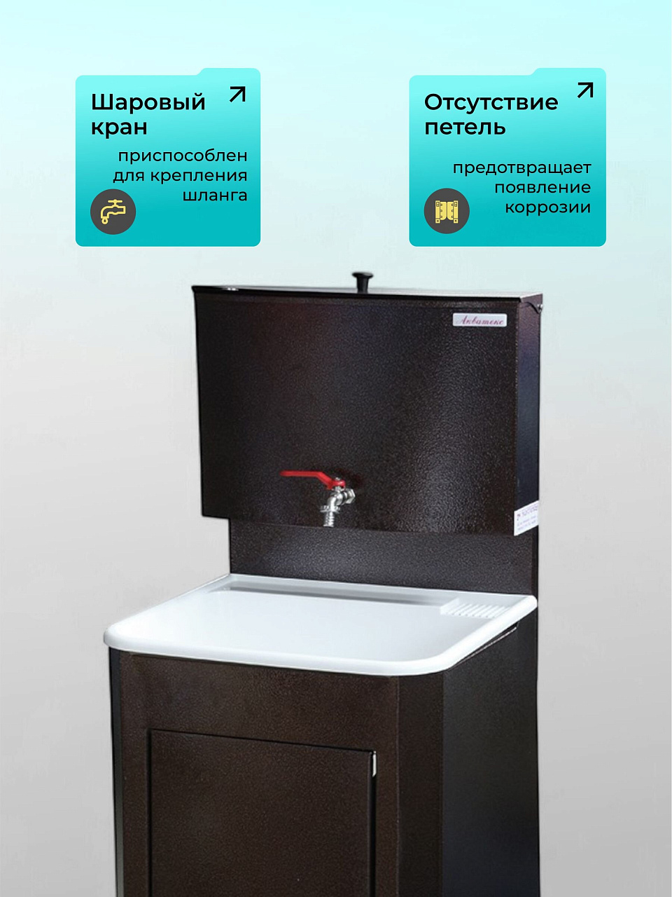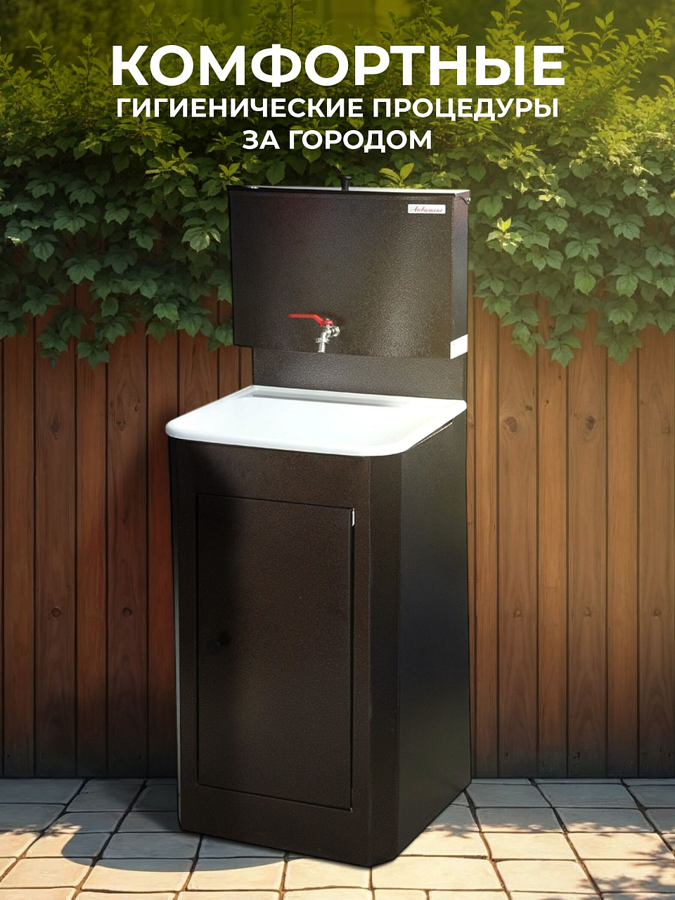 Умывальник отличается удобной сборной конструкцией. Бак рукомойника обработан специальным антикоррозийным покрытием, которое обеспечивает долговечность изделия и исключает появление ржавчины. Тумба имеет ножки для циркуляции воздуха под умывальником и защиты от преждевременной коррозии. Мойка может быть выполнена из металла или пластика (в зависимости от партии).