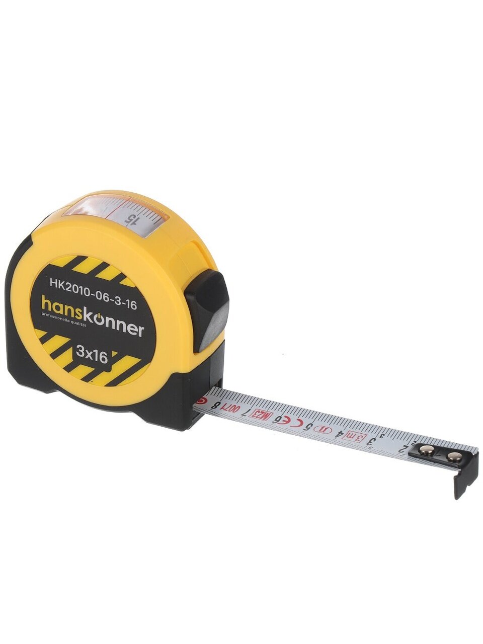 Мерная рулетка – это один из самых простых, но в то же время необходимых строительных инструментов. Она, без сомнений, пригодится Вам как при проведении ремонтных работ, так и в быту. Модель HK2010-06-3-16 оснащена полотном из углеродистой стали С60 с увеличенной толщиной. Это обеспечивает более дальний вылет без излома ленты.