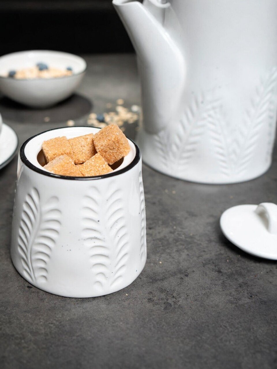 - Универсальность: белый цвет и изысканный дизайн позволяют использовать сахарницу в различных интерьерах, от классики до модерна.
