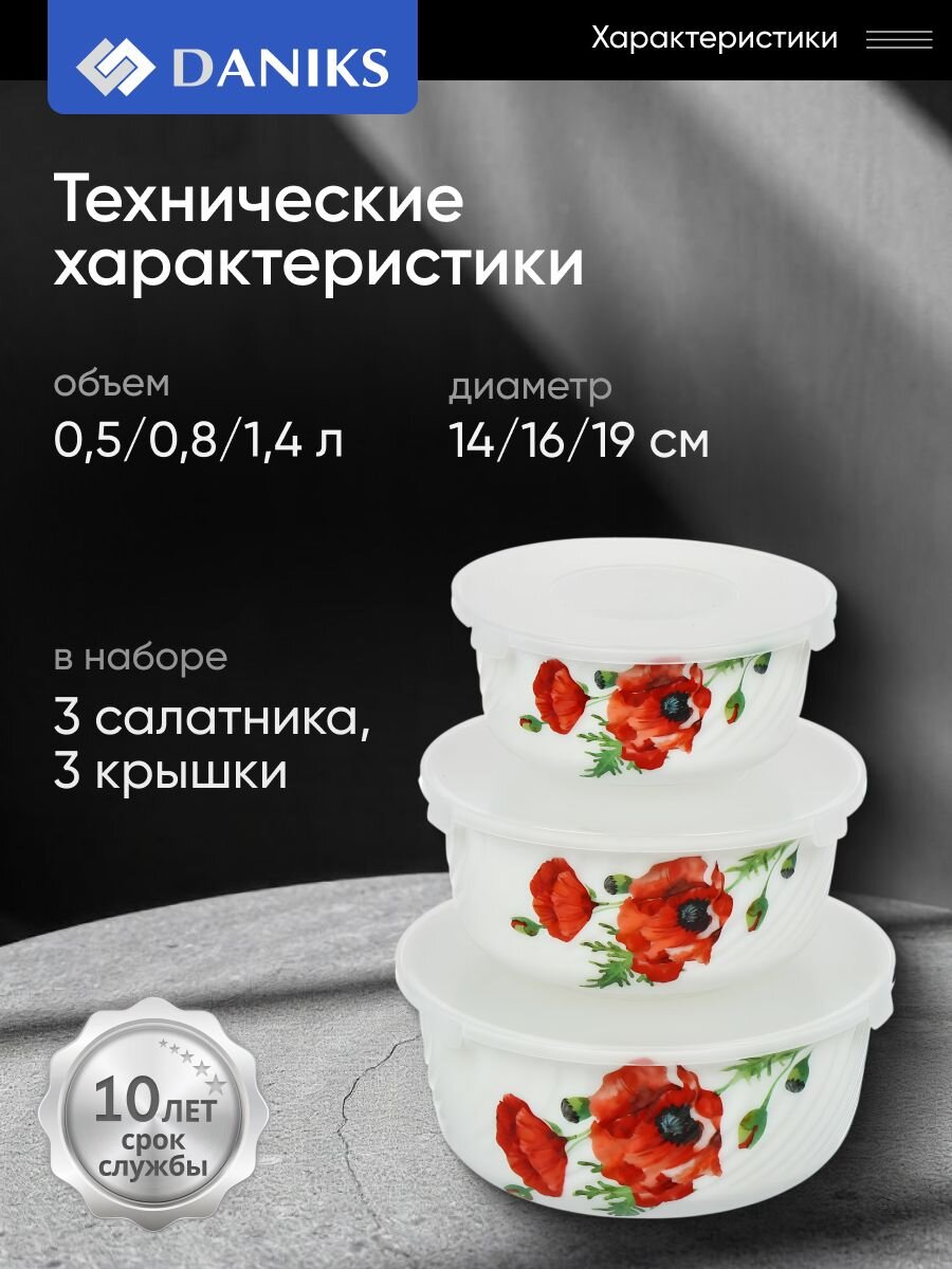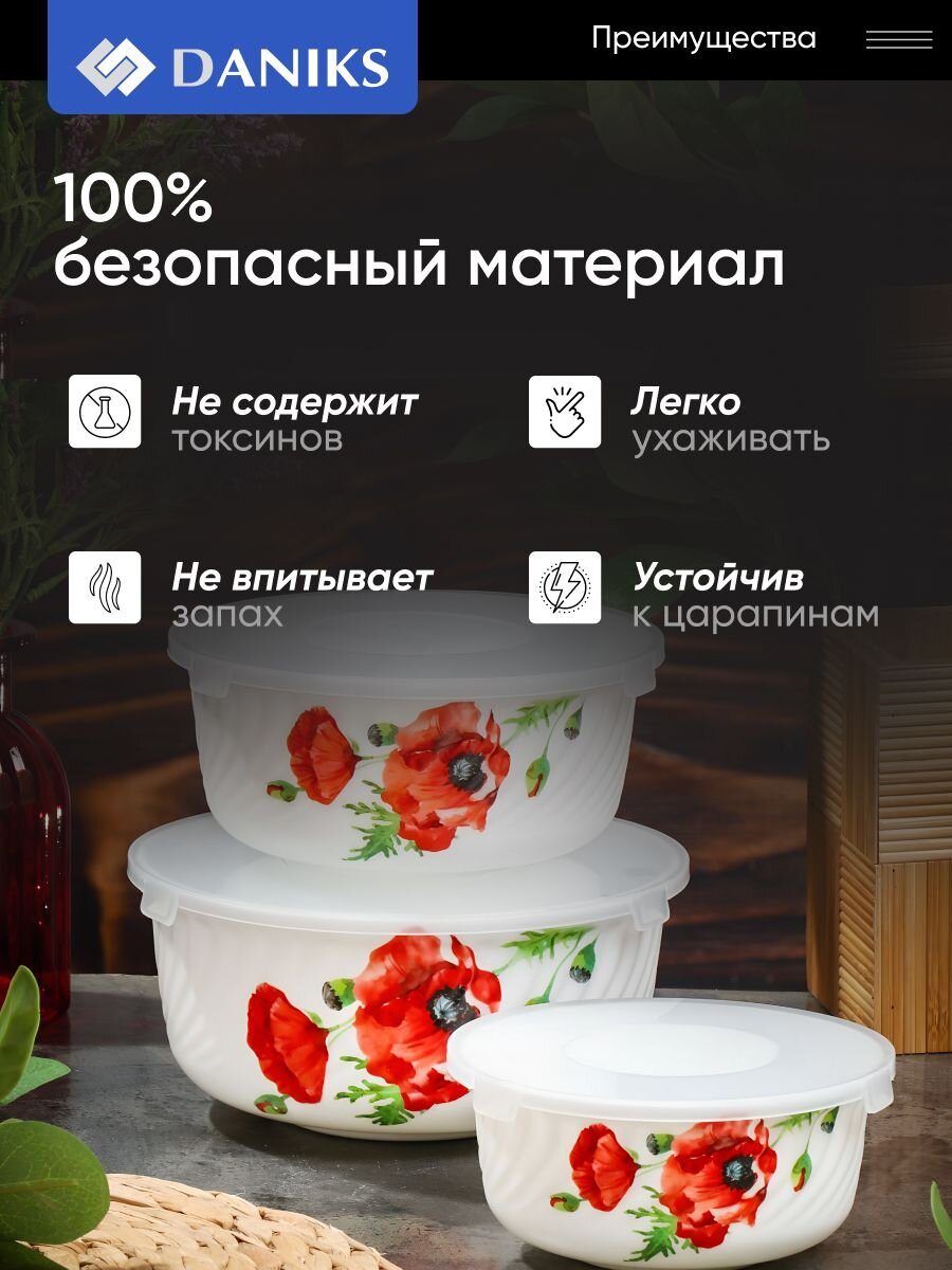 Салатники Daniks Алый мак: 3 стеклокерамических миски с крышками для сервировки и хранения — оптимальный набор для кухни, дачи и подарка.