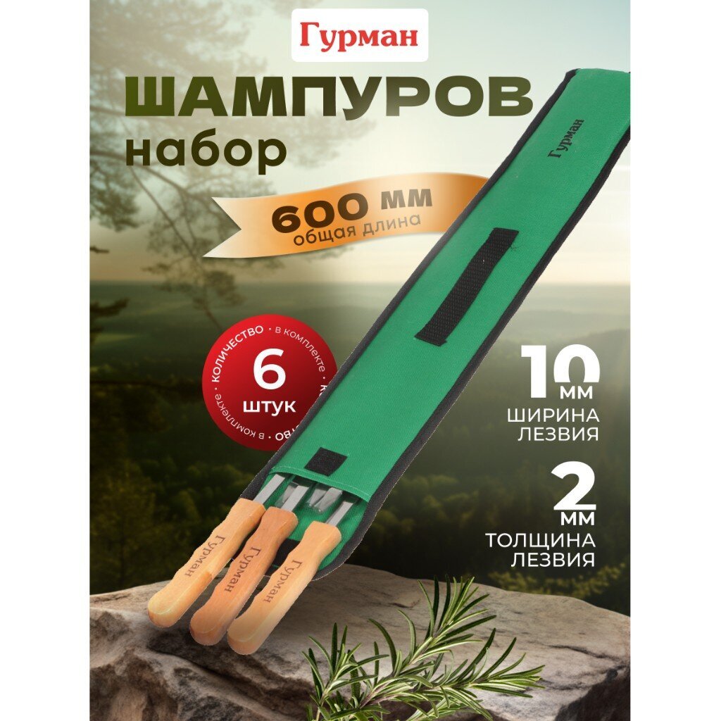 - Данный набор шампуров — идеальный вариант для тех, кто ценит отдых на природе и любит готовить вкусную еду на открытом огне. В комплекте 6 шампуров из нержавеющей стали с деревянными ручками, которые удобно лежат в руке и не скользят.