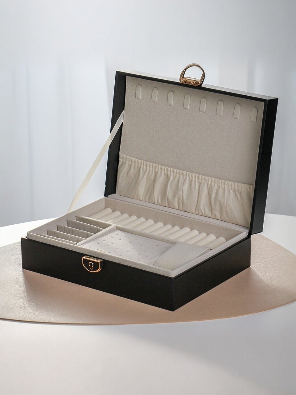 Организация хранения украшений становится легкой задачей благодаря продуманной конструкции. Внутреннее пространство шкатулки удобно использовать для хранения колец, сережек, браслетов, цепочек и других мелких предметов. Каждое украшение найдет свое место, что позволит избежать спутывания и потери. Черный цвет подчеркивает элегантность аксессуаров и придает изделию универсальность, делая его подходящим для любого стиля.