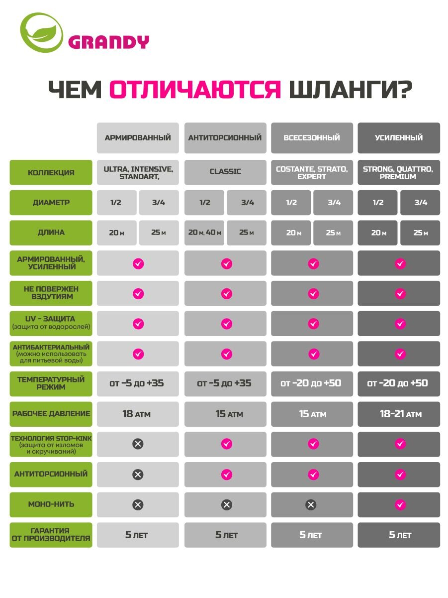 Поливочный шланг марки Grandy обладает всеми необходимыми характеристиками идеального шланга. Он прочный, гибкий и устойчив к перегибам, что позволяет использовать его в разных условиях. Материал успешно противостоит воздействию ультрафиолетовых лучей, что помогает предотвратить его выцветание и повреждение со временем.