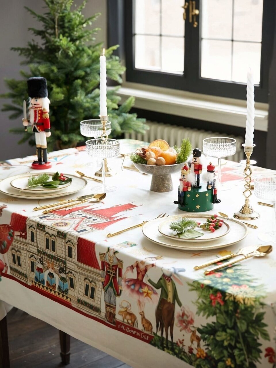 На скатерти изображены завораживающие зимние мотивы. Изысканные узоры словно переносят в сказочный мир, где царят радость, добро и чудеса.