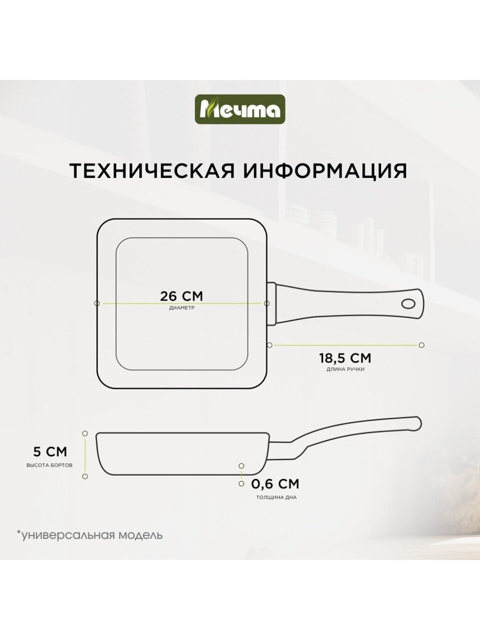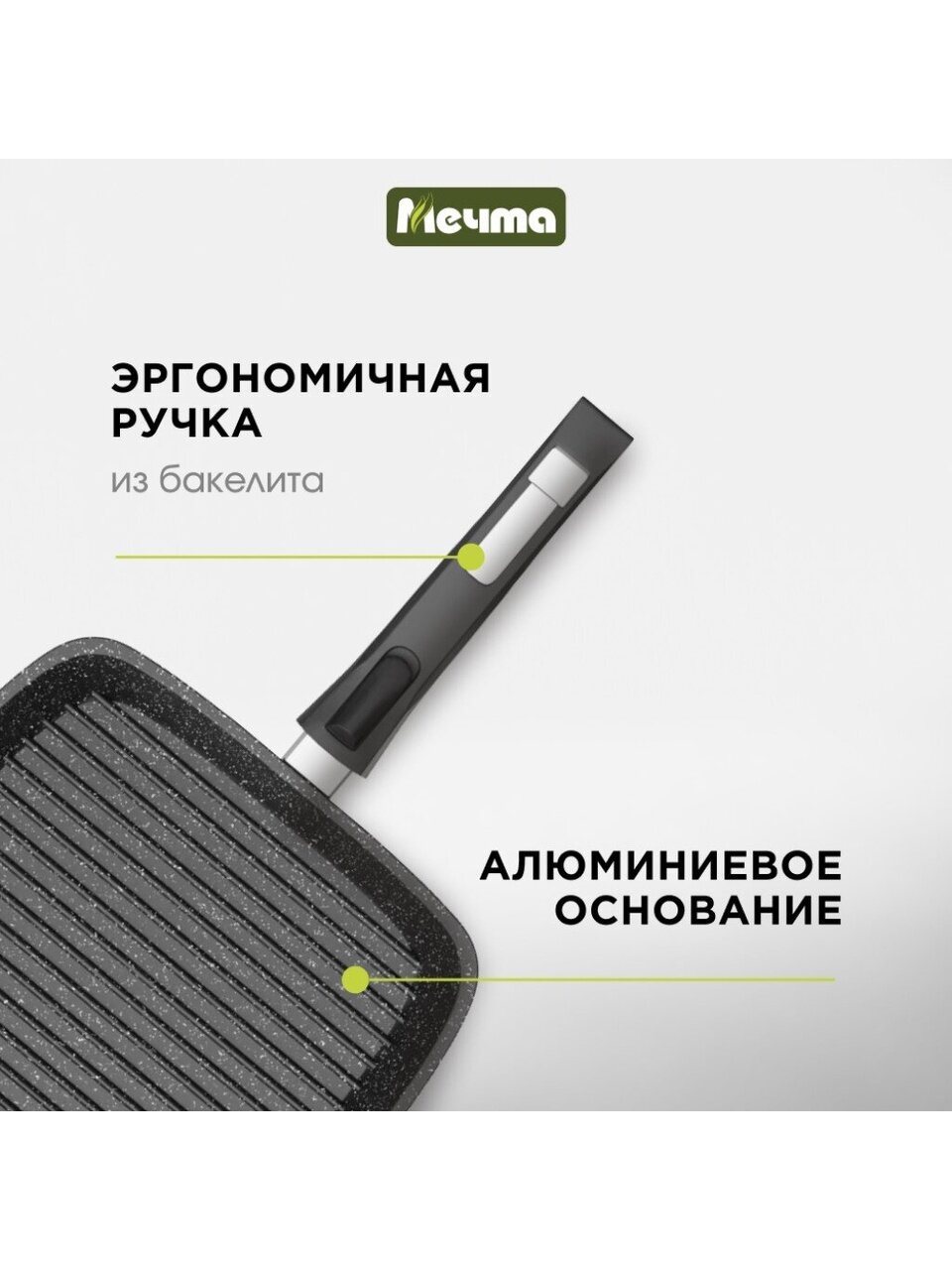 Сковорода-гриль Мечта Гранит star 26 см — это выбор тех, кто ищет универсальную и долговечную посуду для здорового питания. Благодаря литому алюминию и толстому дну (6 мм), тепло распределяется равномерно, что предотвращает пригорание. Гранитное антипригарное покрытие позволяет готовить без масла — блюда получаются сочными, а сковорода легко очищается, даже в посудомоечной машине.
