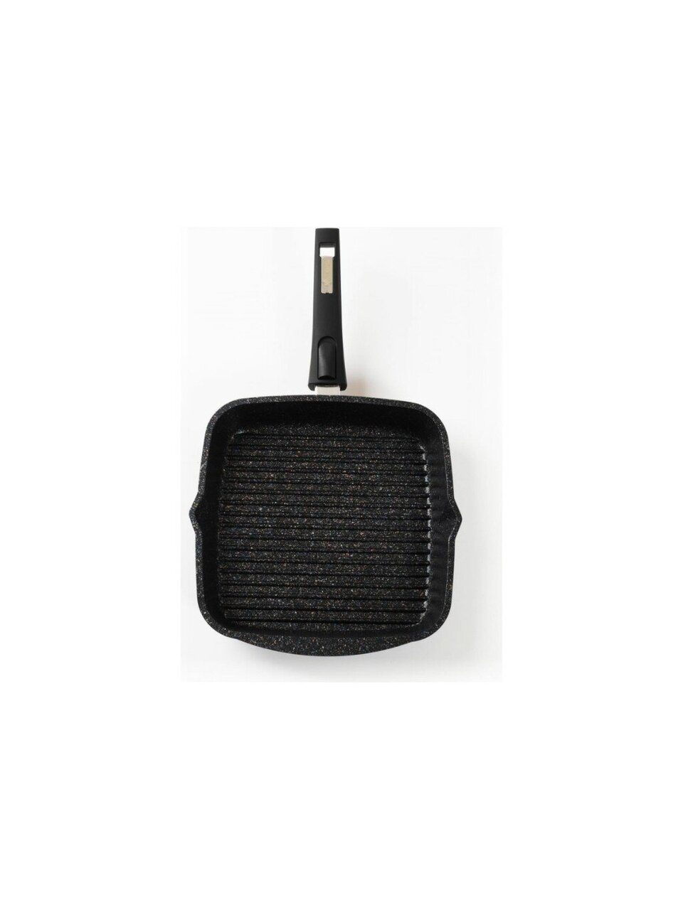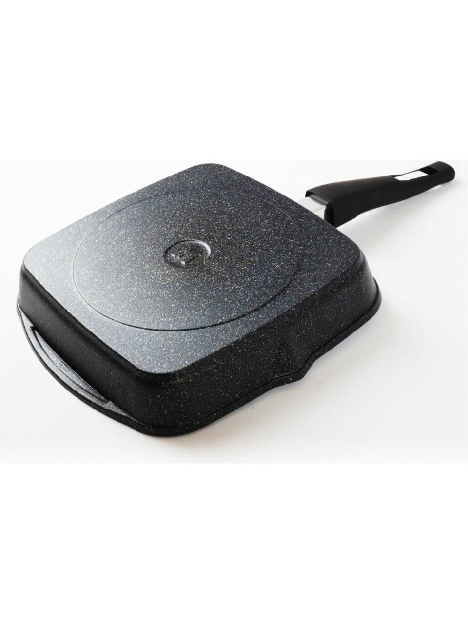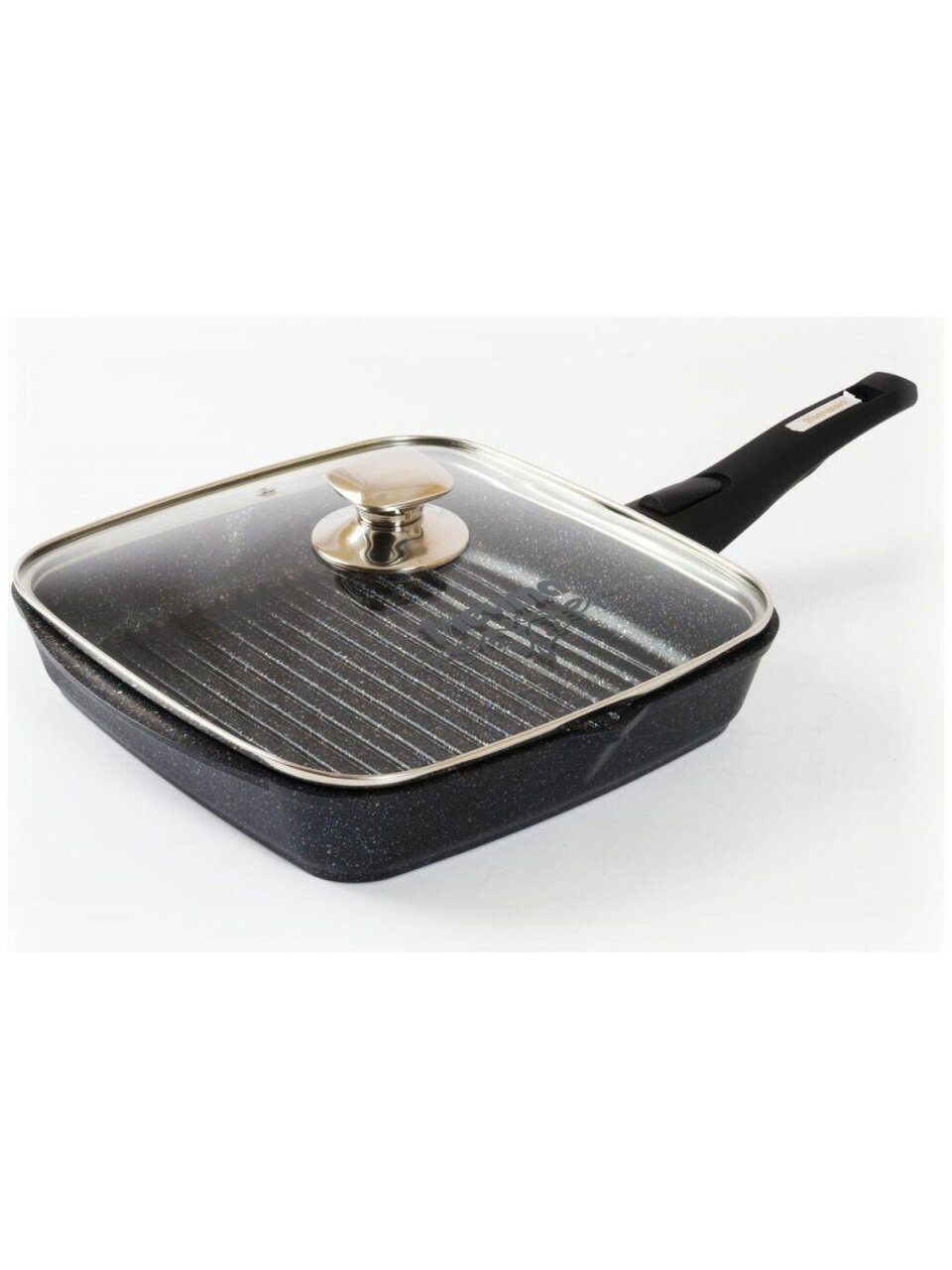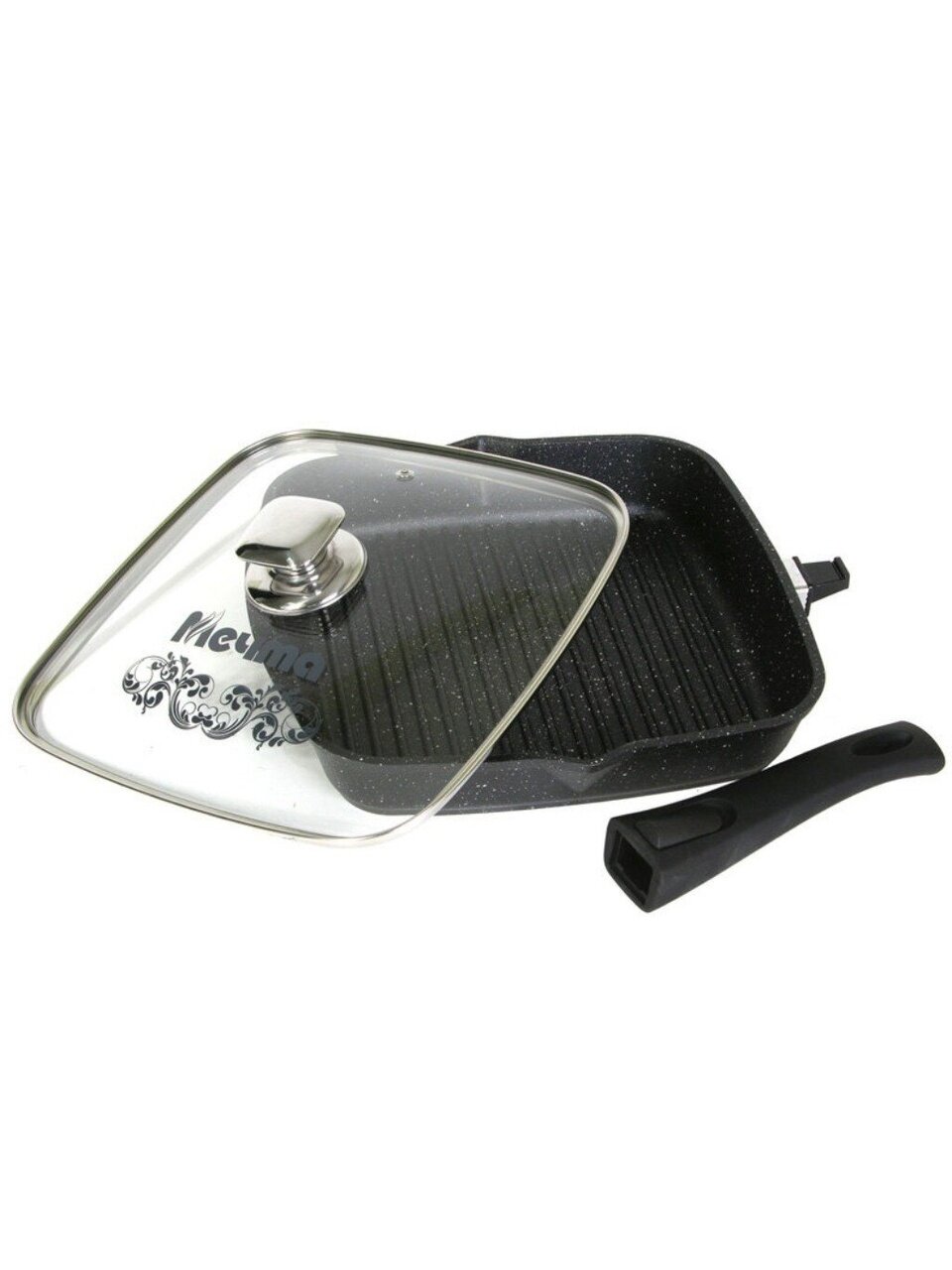 Сковорода-гриль Мечта Гранит star 26 см: сочные стейки и овощи без масла, антипригарное покрытие, съемная ручка и крышка для удобства.