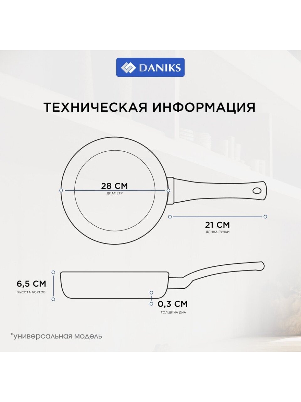 Диаметр 28 см, высота борта 65 мм — удобно для жарки, тушения, приготовления яичницы, оладий, мяса, рыбы или овощей. Универсальная форма и вместительность подойдут для семьи или компании.