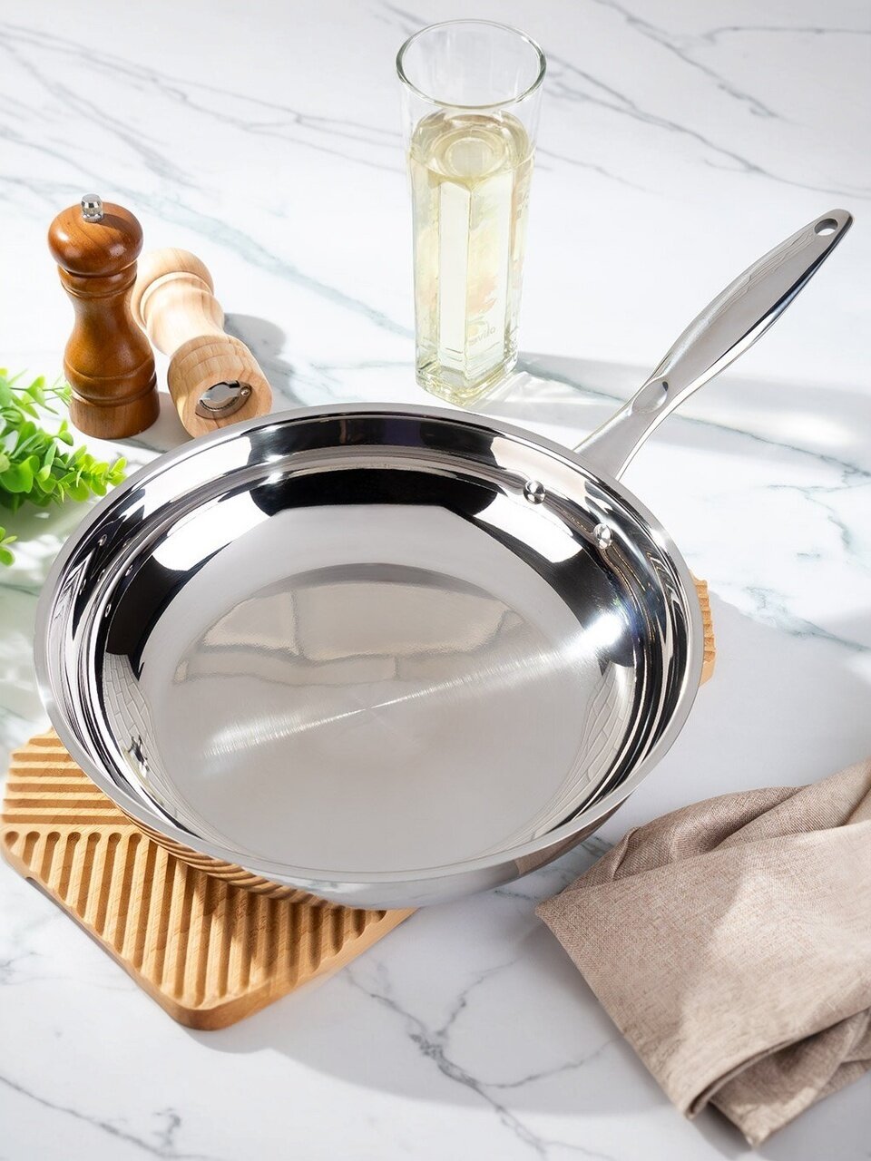 Если вы выбираете между сковородой с антипригарным покрытием и нержавейкой, обратите внимание: нержавеющая сталь — долговечнее, не боится царапин, можно мыть в посудомоечной машине. Это отличный вариант для жарки мяса, курицы, рыбы и приготовления завтраков. Часто ищут: «Как использовать сковороду без покрытия?» — достаточно разогреть масло, чтобы продукты не прилипали. Отсутствие съемной ручки делает конструкцию надежной, а большой диаметр позволяет готовить сразу на всю семью.