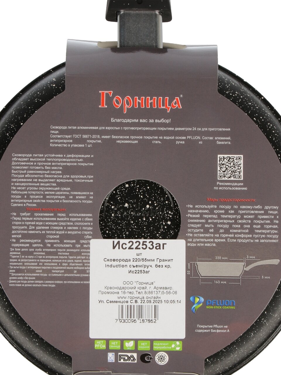 Сковорода литой алюминий, 22 см, антипригарное покрытие, Горница, Гранит Induction, съемная ручка, индукция, Ис2253аг
