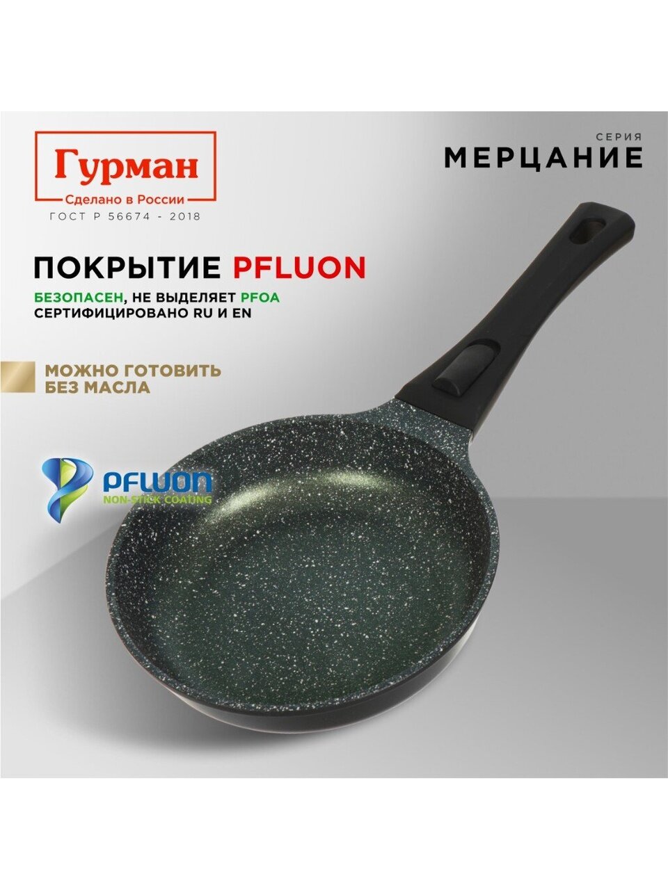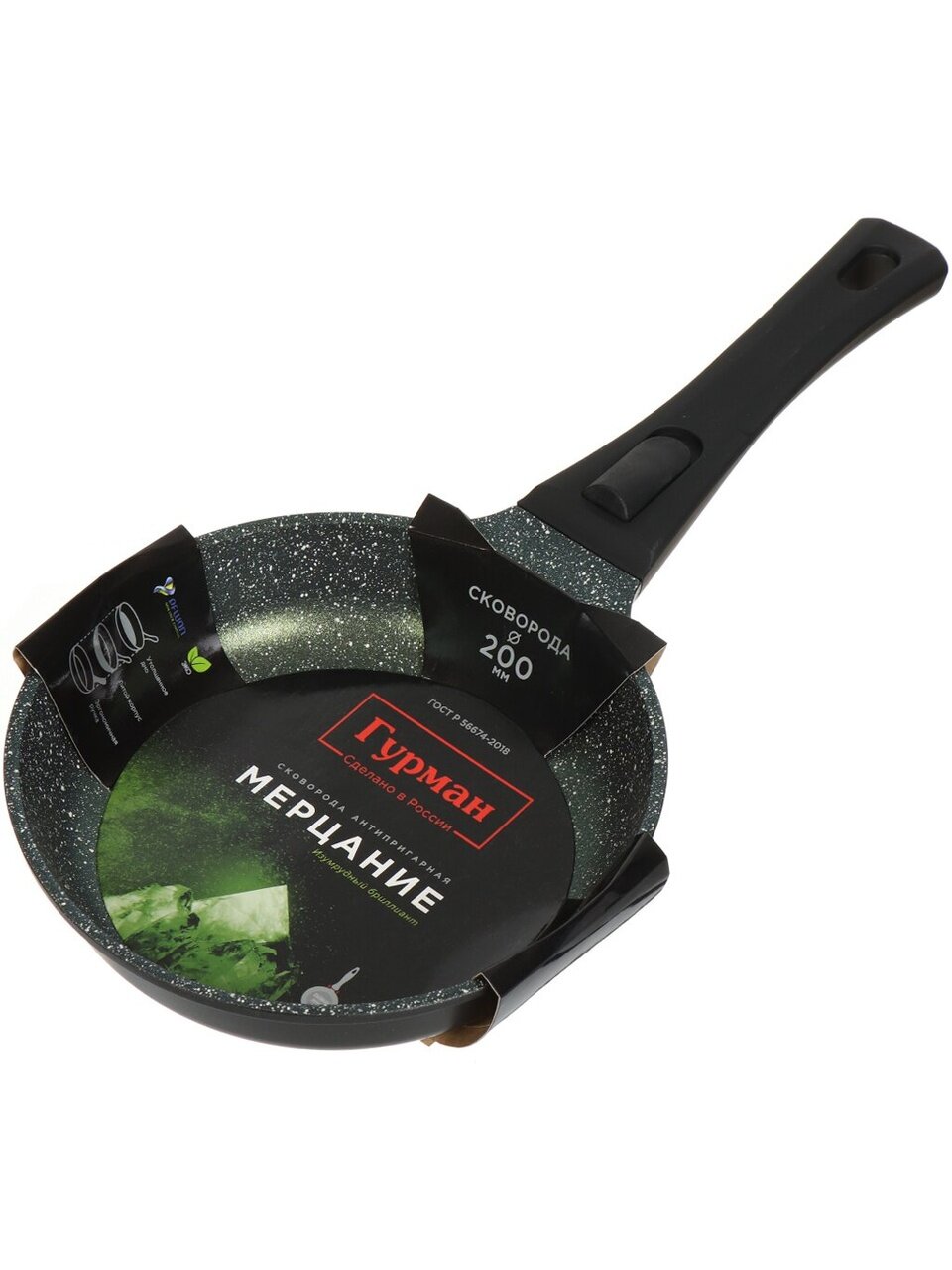 Сковорода «Гурман Мерцание Изумрудный бриллиант» диаметром 20 см — это универсальный выбор для тех, кто ищет, какую сковороду купить недорого для дачи или компактной кухни. Благодаря литому алюминию и мраморному антипригарному покрытию, блюда готовятся без масла, а чистка занимает минимум времени. Съемная ручка делает сковороду удобной для хранения и использования в духовке. Если вы спрашиваете, чем отличается литая алюминиевая сковорода от штампованной — литая прослужит дольше и не деформируется при нагреве.