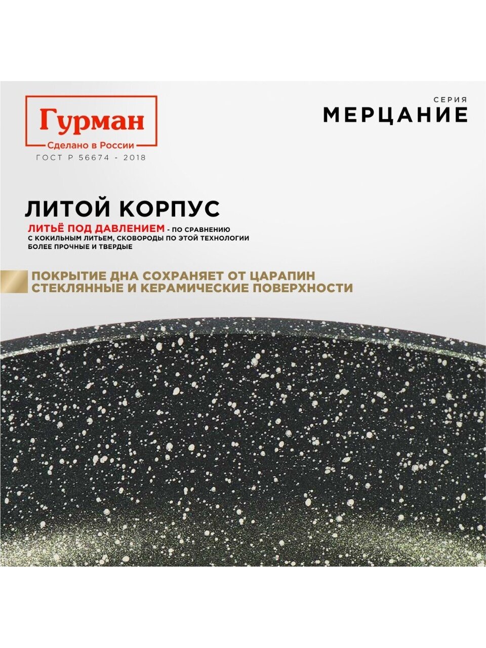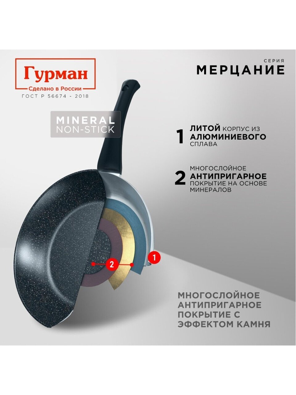 Сковорода подходит для жарки мяса, рыбы, яичницы, оладий и омлетов. Не поддерживает индукционные плиты, но отлично работает на газовых, электрических и стеклокерамических поверхностях. Если вы ищете, как выбрать сковороду для небольшой семьи или подарка, модель ГМ2001ИБС — оптимальный вариант: лёгкая (0,7 кг), глубокая (высота борта 45 мм), с гарантийным сроком 36 месяцев. В отличие от аналогов, здесь продуман баланс веса и толщины стенок, что гарантирует равномерный прогрев и защиту от пригорания.