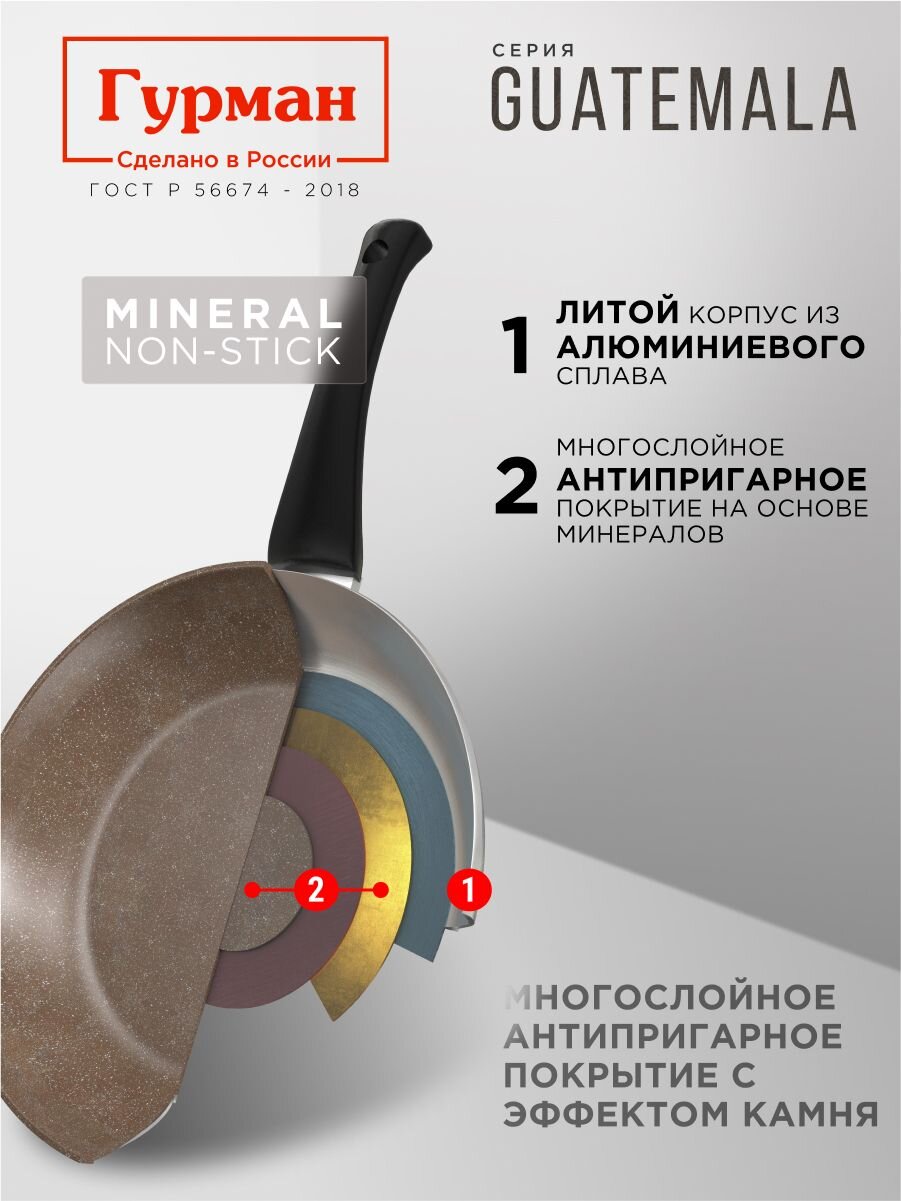 Подходит ли для индукционных плит? Эта сковорода рассчитана на газовые, электрические и стеклокерамические плиты, а также для духовки. Для индукции не подходит, что важно учитывать при выборе. Если вы ищете, какую сковороду купить недорого для дачи или дома — Guatemala от Гурман сочетает надежность, современный дизайн и практичность.