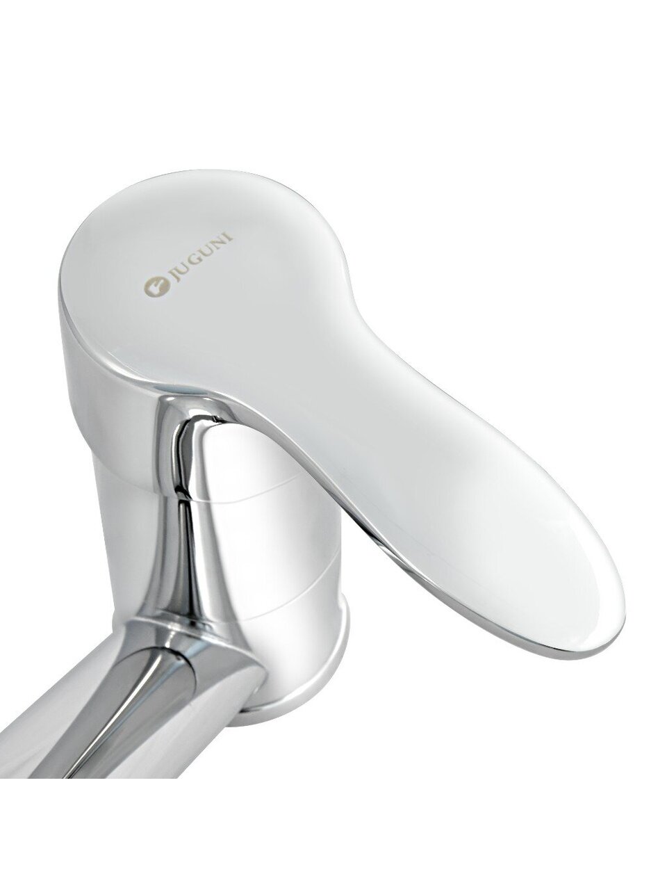 Смеситель для раковины Juguni 0402.603 — это современный однорычажный кран с коротким поворотным изливом (13,5 см), который легко впишется в интерьер как классической, так и современной ванной комнаты. Благодаря компактным размерам и горизонтальному монтажу, он особенно популярен среди тех, кто ищет, какой смеситель выбрать для маленькой раковины или умывальника. Корпус из силумина с глянцевой хромированной поверхностью защищён от коррозии, а керамический картридж обеспечивает плавное и долговечное управление потоком воды.