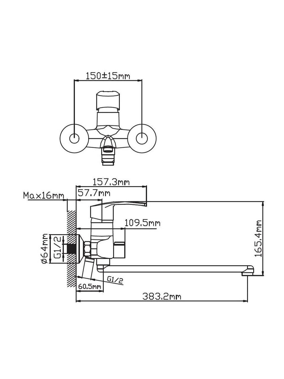 Модель предназначена для вертикального настенного монтажа на 2 отверстия с межосевым расстоянием 150 мм, крепится на гайку стандартом 1/2".