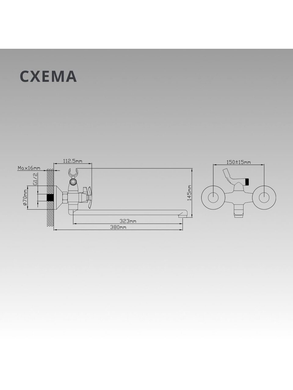 Смеситель предназначен для вертикального настенного монтажа, межосевое расстояние крепления — 150 мм, подходит для стандартных двухотверстных установок.