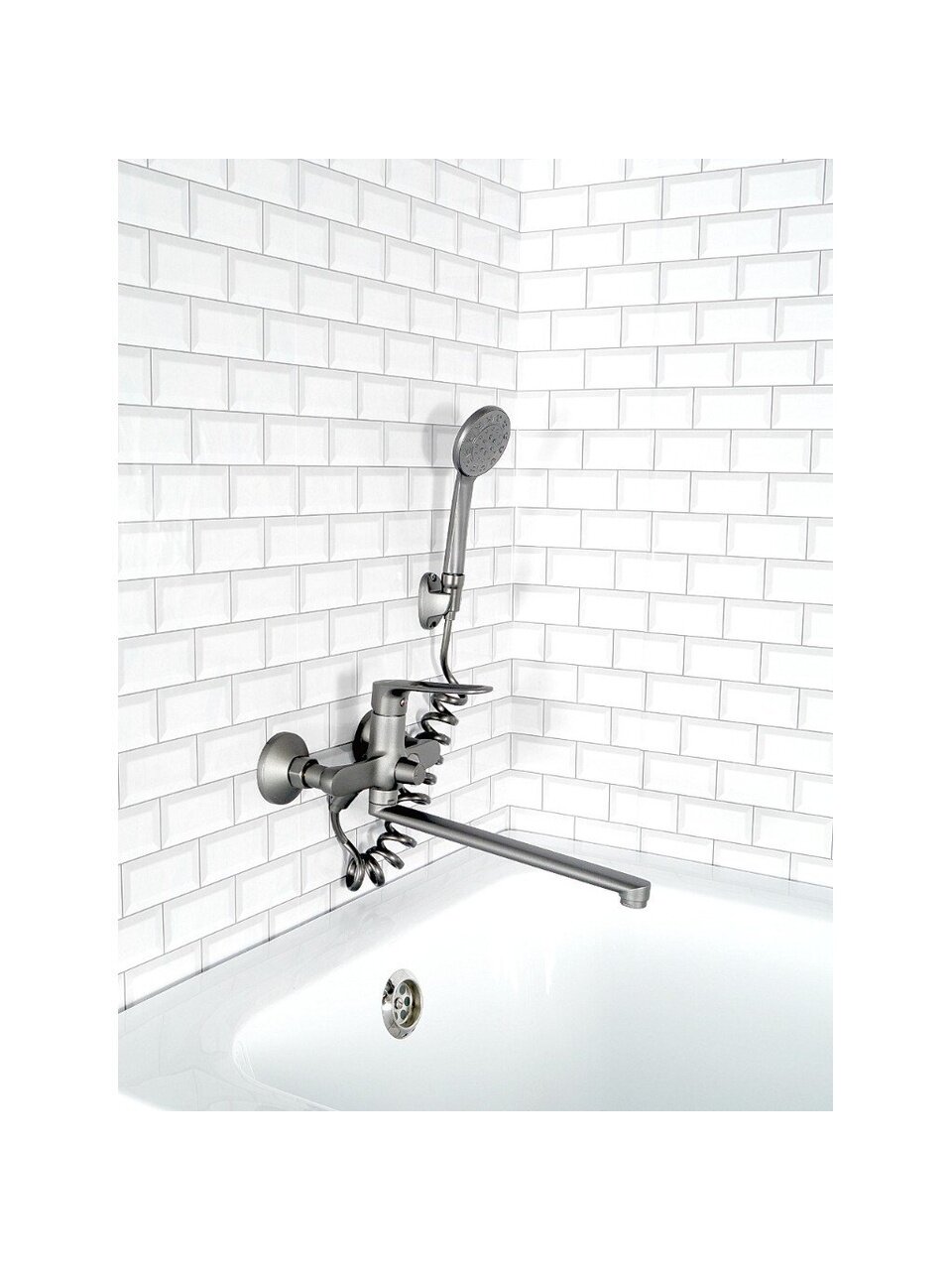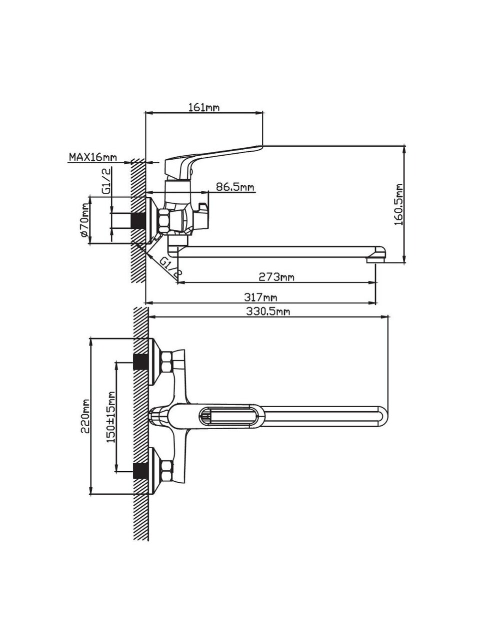 Длина излива — 27,3 см, высота — 16,5 см. Крепление осуществляется на 2 отверстия с межосевым расстоянием 150 мм, стандартная подводка 1/2", крепится гайкой на стену.