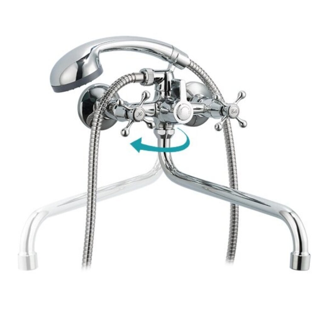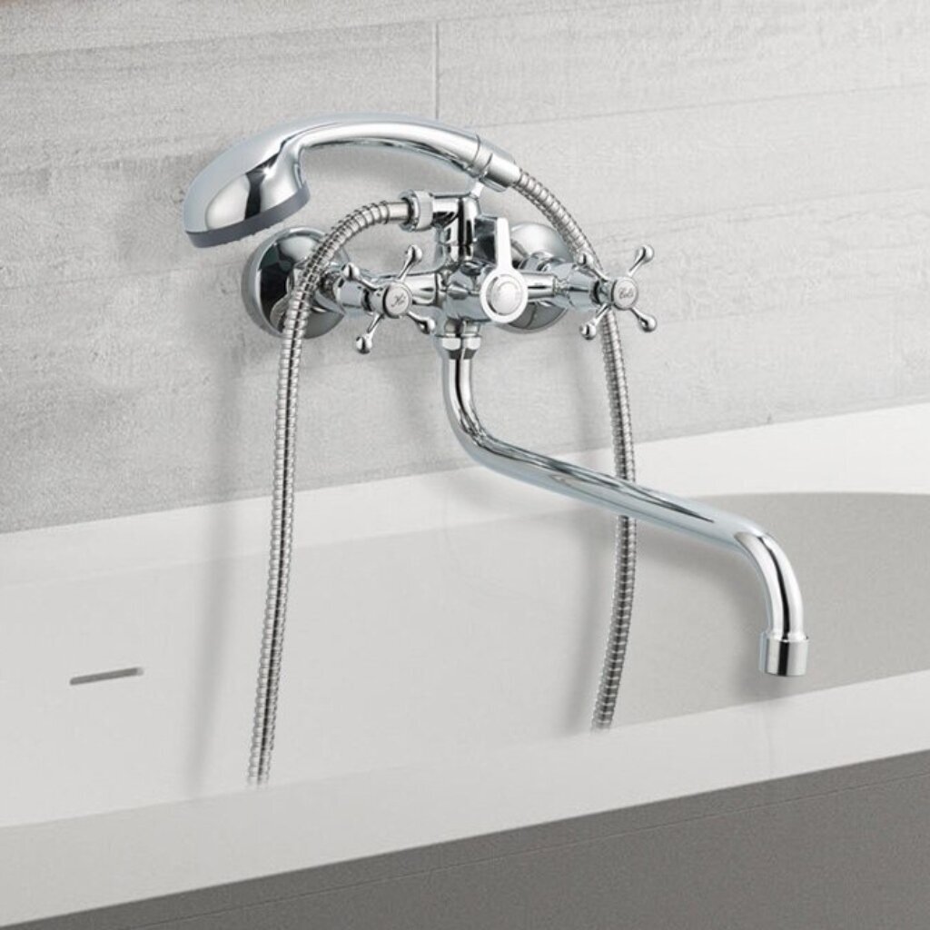 - Параметры: корпус из силумина, глянцевая хромированная поверхность, поворотный длинный излив 30 см — удобно для наполнения ванны и мытья душем.