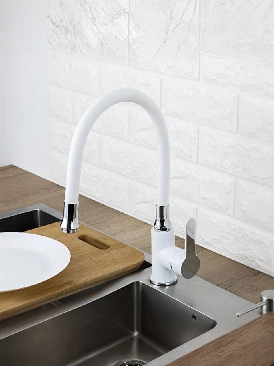 Благодаря среднему размеру излива (54 см) и высокой дуге, этот смеситель подойдет для стандартных и глубоких моек. Белая глянцевая поверхность легко очищается и сохраняет презентабельный вид. В отличие от пластиковых аналогов, латунный корпус устойчив к механическим повреждениям и не тускнеет со временем.
