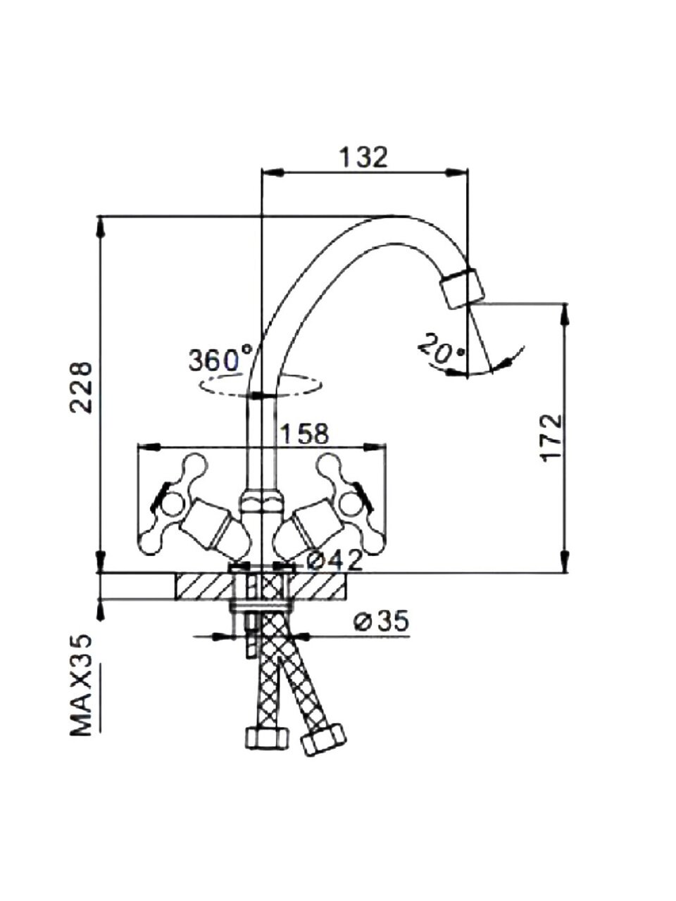 Высота излива — 17,2 см, длина — 13,2 см. Монтажное отверстие — 42 мм, стандартная подводка 1/2". Подходит для большинства кухонных моек.