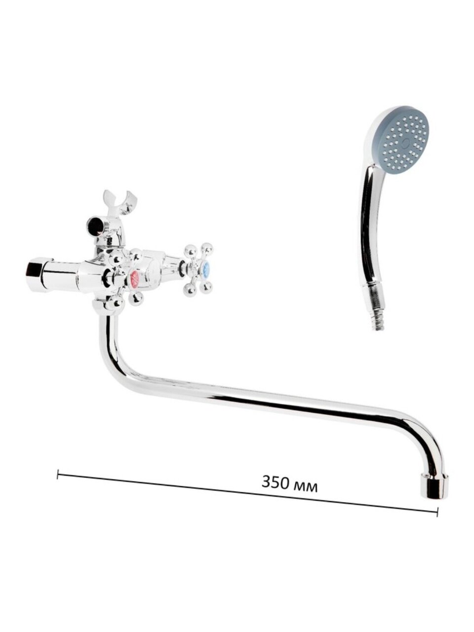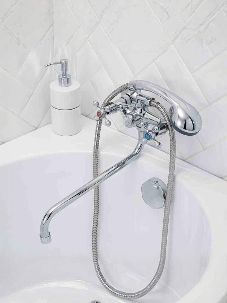Длина излива составляет 35 см, он поворотный, что удобно для наполнения ванны или использования душа в разных сценариях.