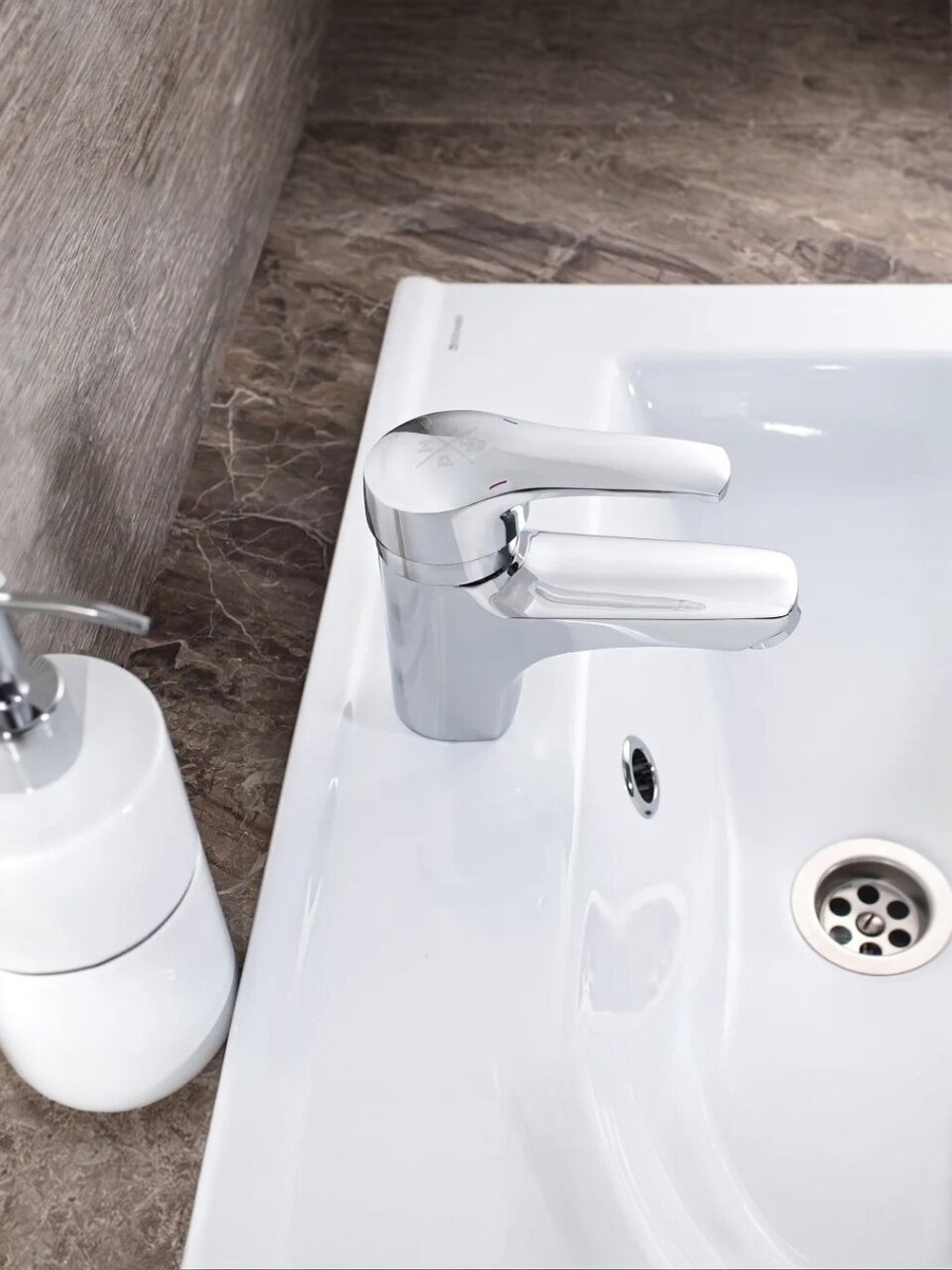 - Современный монолитный смеситель с коротким изливом — удобно для малых раковин и экономии пространства