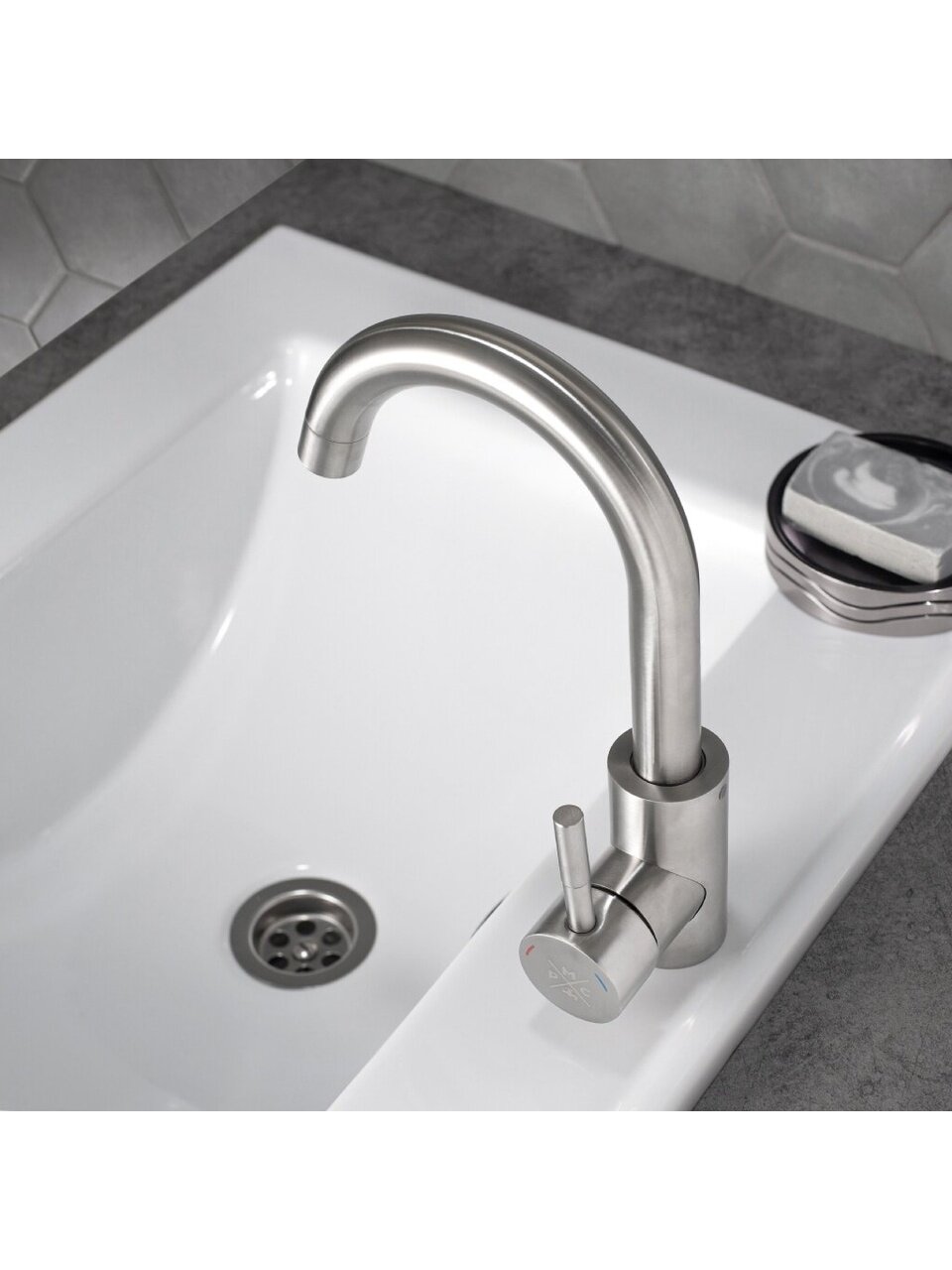 Корпус смесителя изготовлен из нержавеющей стали, высота излива — 15,7 см, длина — 13 см, поверхность матовая для лёгкой очистки.