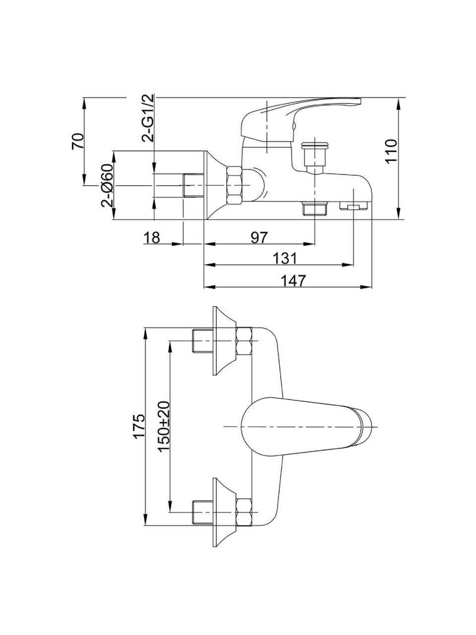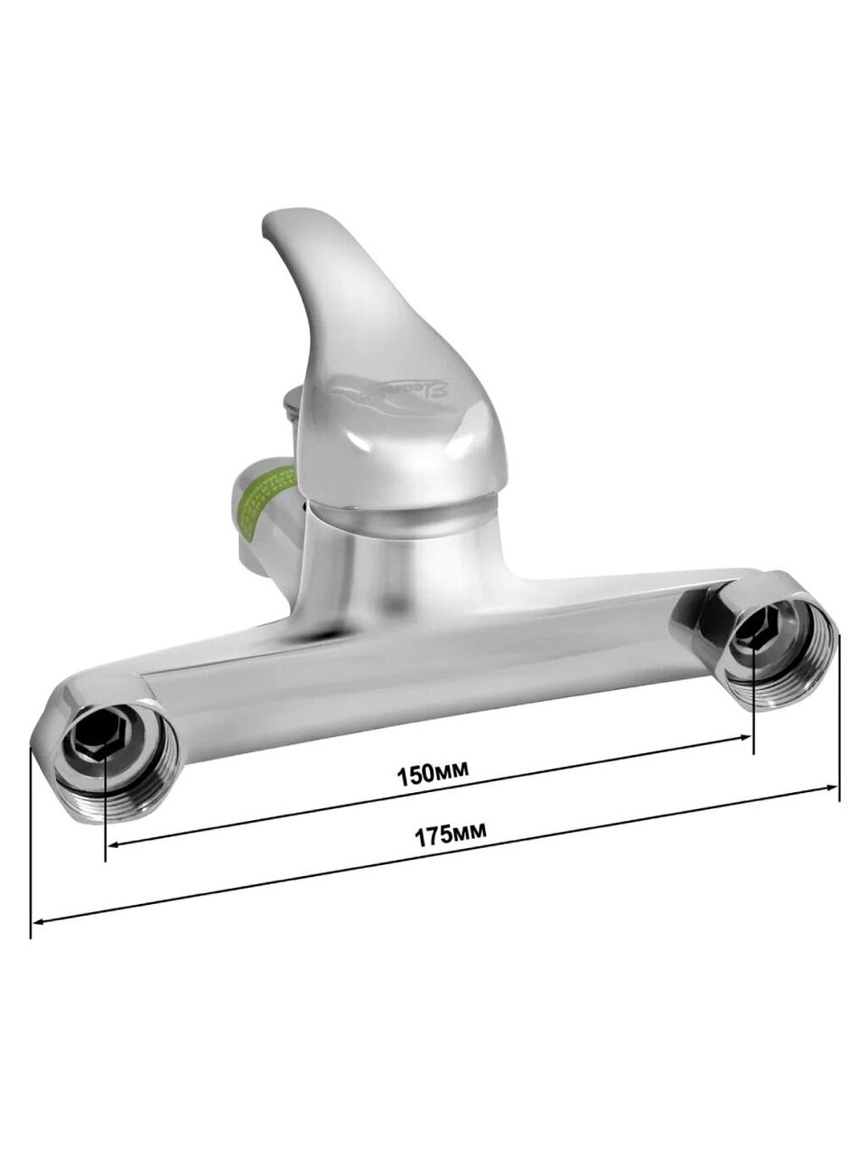 Смеситель устанавливается вертикально на стену (настенный монтаж), подходит для стандартных межосевых расстояний 150 мм и монтируется на 2 отверстия с помощью гайки.