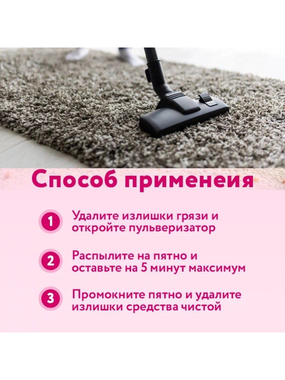 Способ применения: удалите с ковра излишки грязи, распылите средство на пятно и оставьте на 5 минут. Удалите остатки влаги чистой сухой тканью. Для избавления от трудновыводимых пятен повторите процедуру. Перед использованием проверьте стойкость окраски. Не используйте для бархата, парчи, шелка, ковров ручной работы и материалов, не предназначенных для влажной чистки.