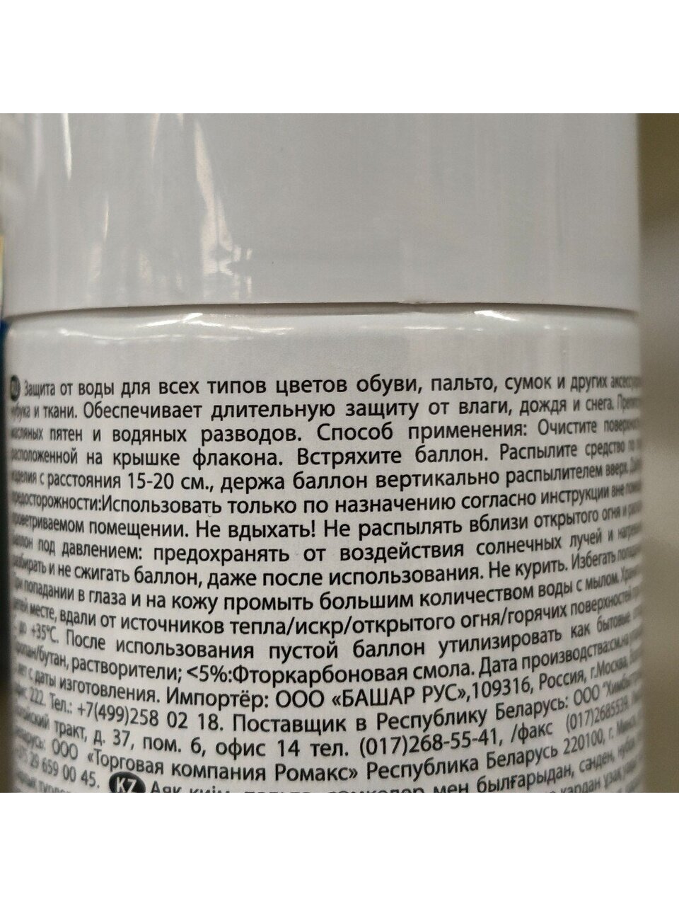 Универсальный водоотталкивающий спрей для всех типов обуви, пальто, сумок и других аксессуаров. Подходит для всех цветов изделий из кожи, замши, нубука и ткани. Обеспечивает длительную защиту от влаги, дождя и снега. Препятствует образованию масляных пятен и водяных разводов.