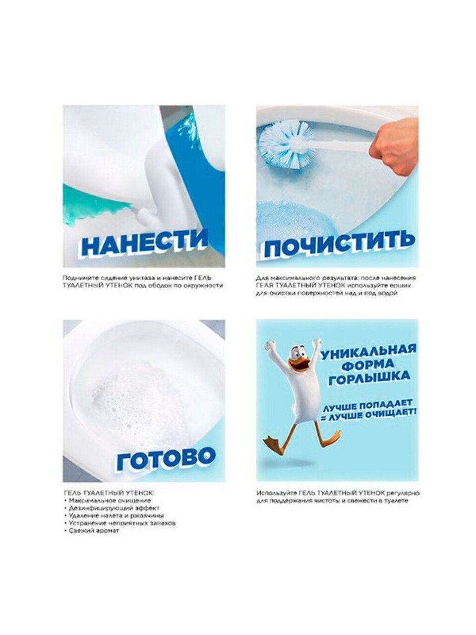 - -Для удаления загрязнений в нижней части унитаза налейте средство в воду и оставьте на 60 минут, смойте