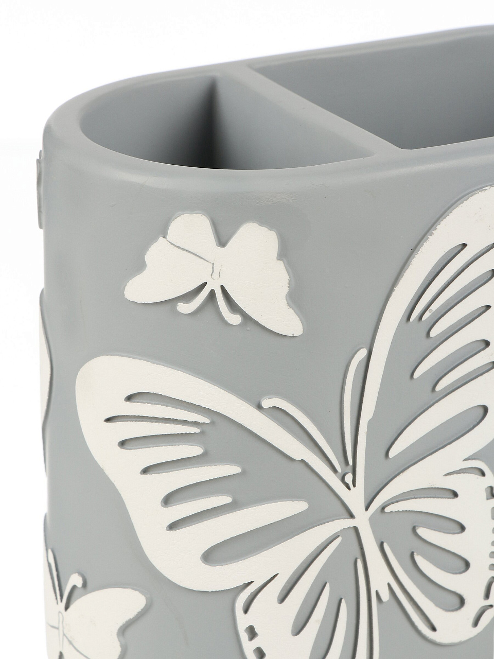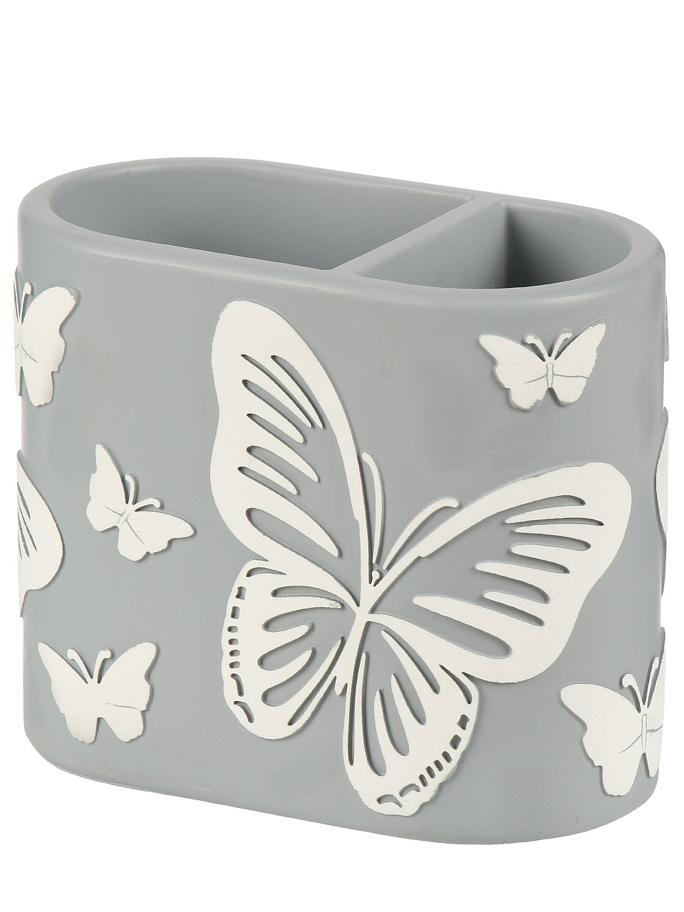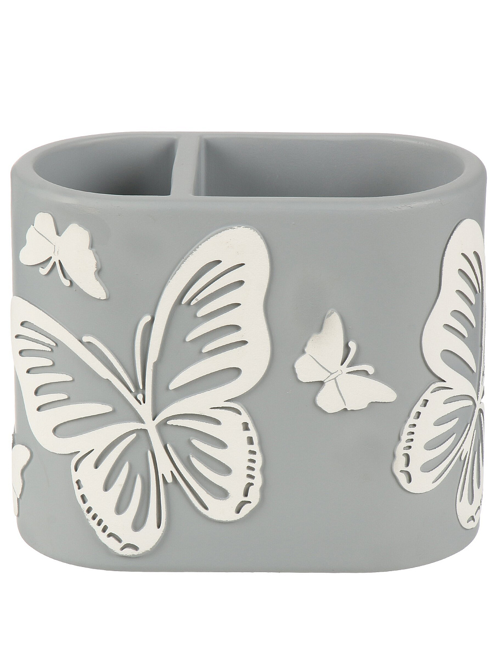 Стакан для зубных щеток 12.2х6.5х10 см из полистоуна «Бабочки на сером»: элегантное решение для ванной, надёжный двойной органайзер, стильный подарок.