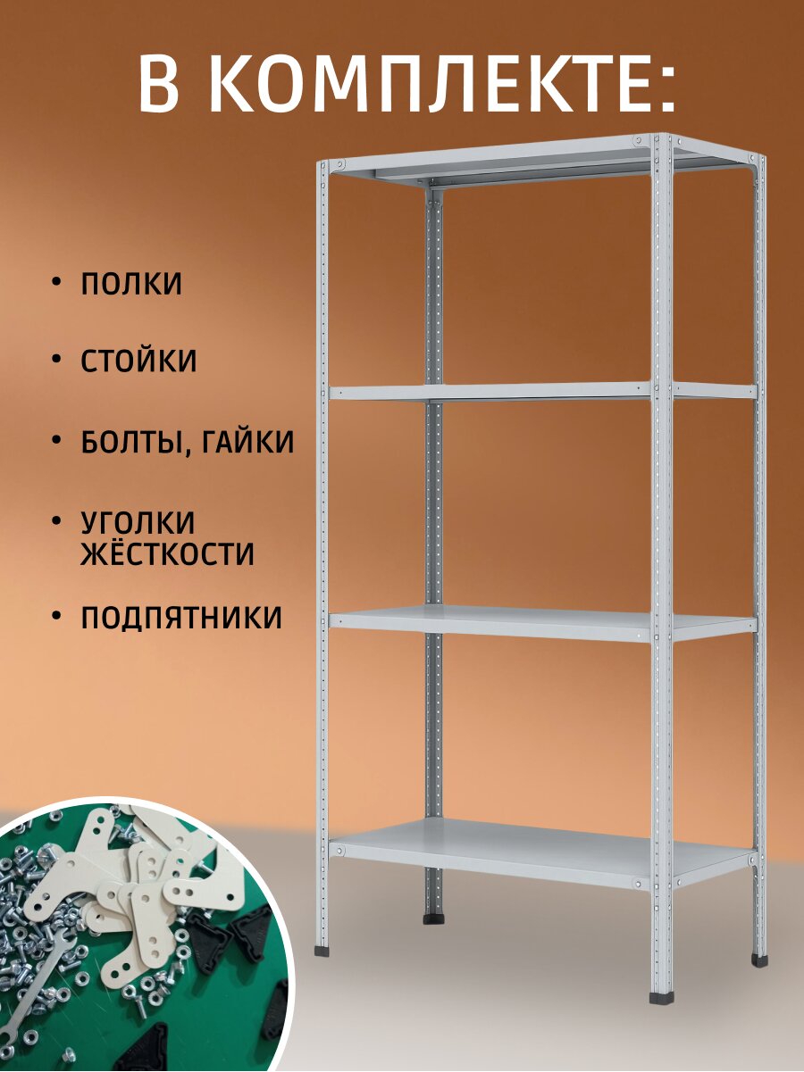 Стеллаж поставляется в разобранном виде и укомплектован 4-мя металлическими стойками, 4-мя металлическими полками и необходимым крепежом для сборки.
