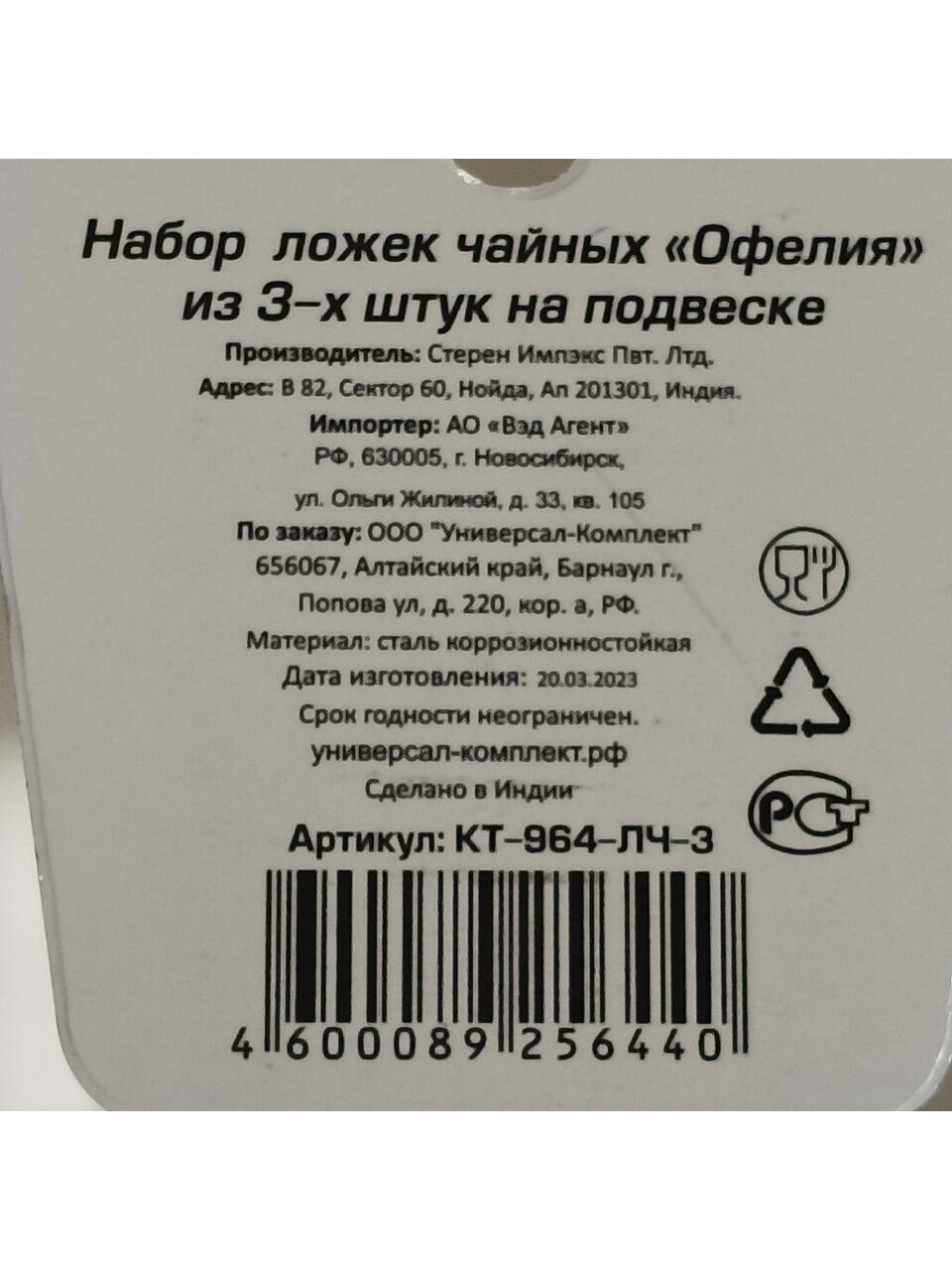 Вы можете приобрести «Ложка нержавеющая сталь, 3 предмета, чайная, Катунь, Офелия, КТ-964-ЛЧ-3, на подвесе» и другие товары в нашем интернет-магазине в Армавире по низким ценам и с бесплатным самовывозом.