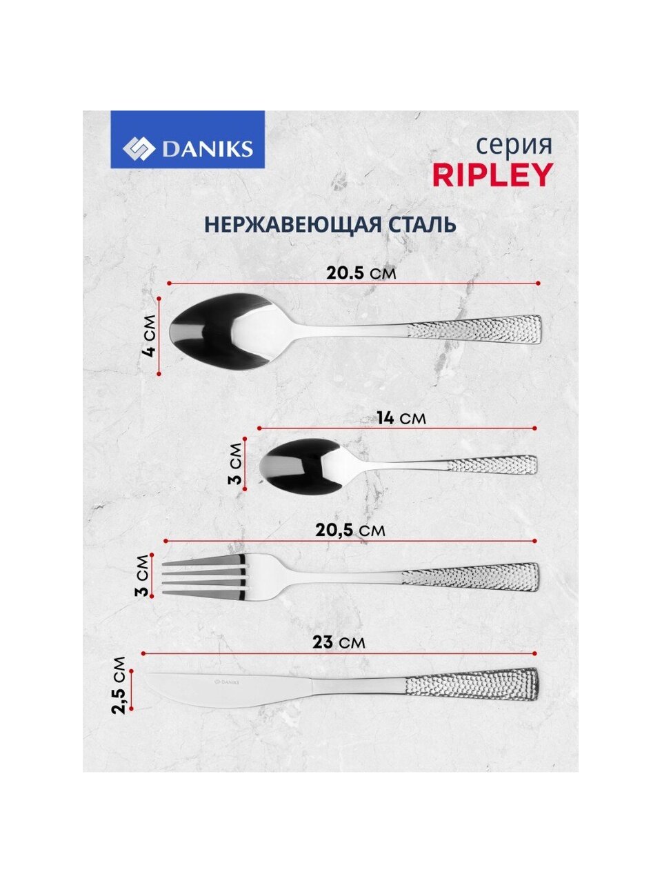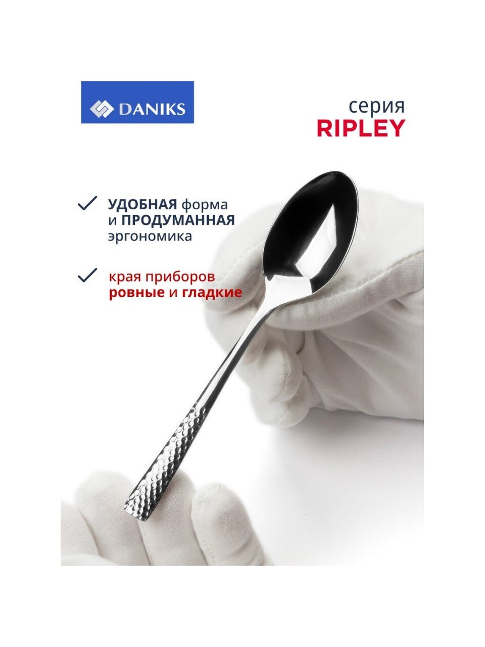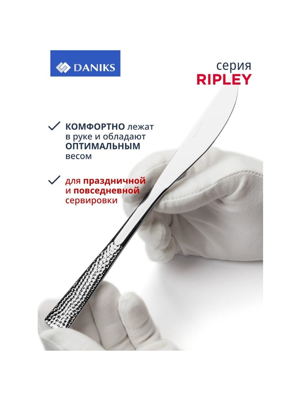 Часто спрашивают: «Как выбрать столовые приборы для ежедневного использования?» и «Подходит ли этот набор для подарка?» — Daniks Ripley отвечает этим требованиям: приборы можно мыть в посудомоечной машине, они не требуют особого ухода, не темнеют и сохраняют блеск даже при активной эксплуатации. В отличие от аналогов с пластиковыми ручками или покрытием, полностью металлические приборы не трескаются и не теряют внешний вид со временем.