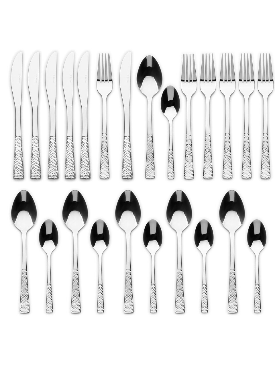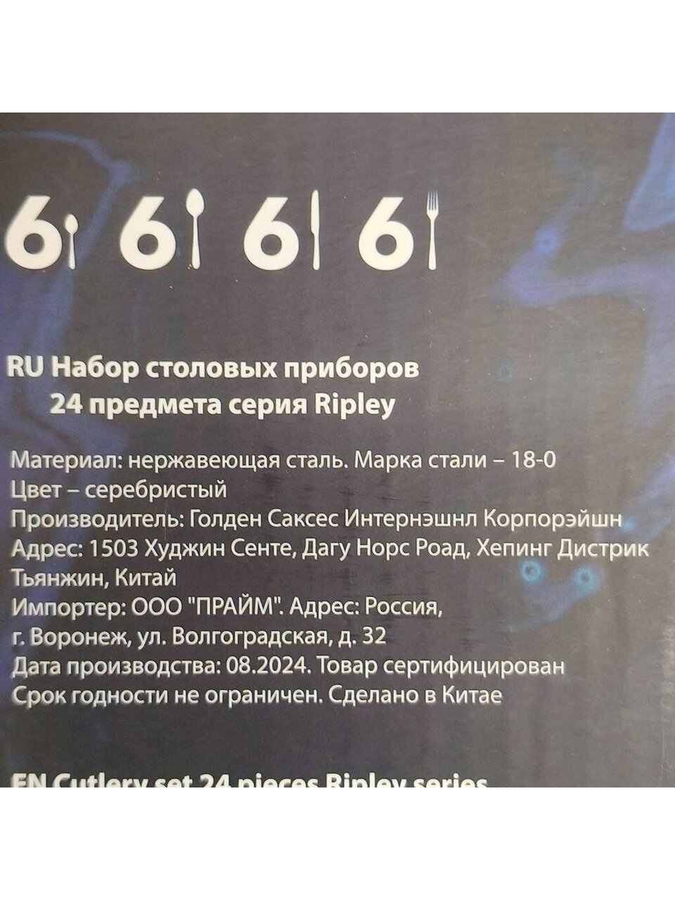 В наборе 24 предмета, предназначен для 6 персон: по 4 вилки, ножа, столовые и чайные ложки. Длина каждого прибора — 20,5 см, вес всего комплекта — 1,2 кг.