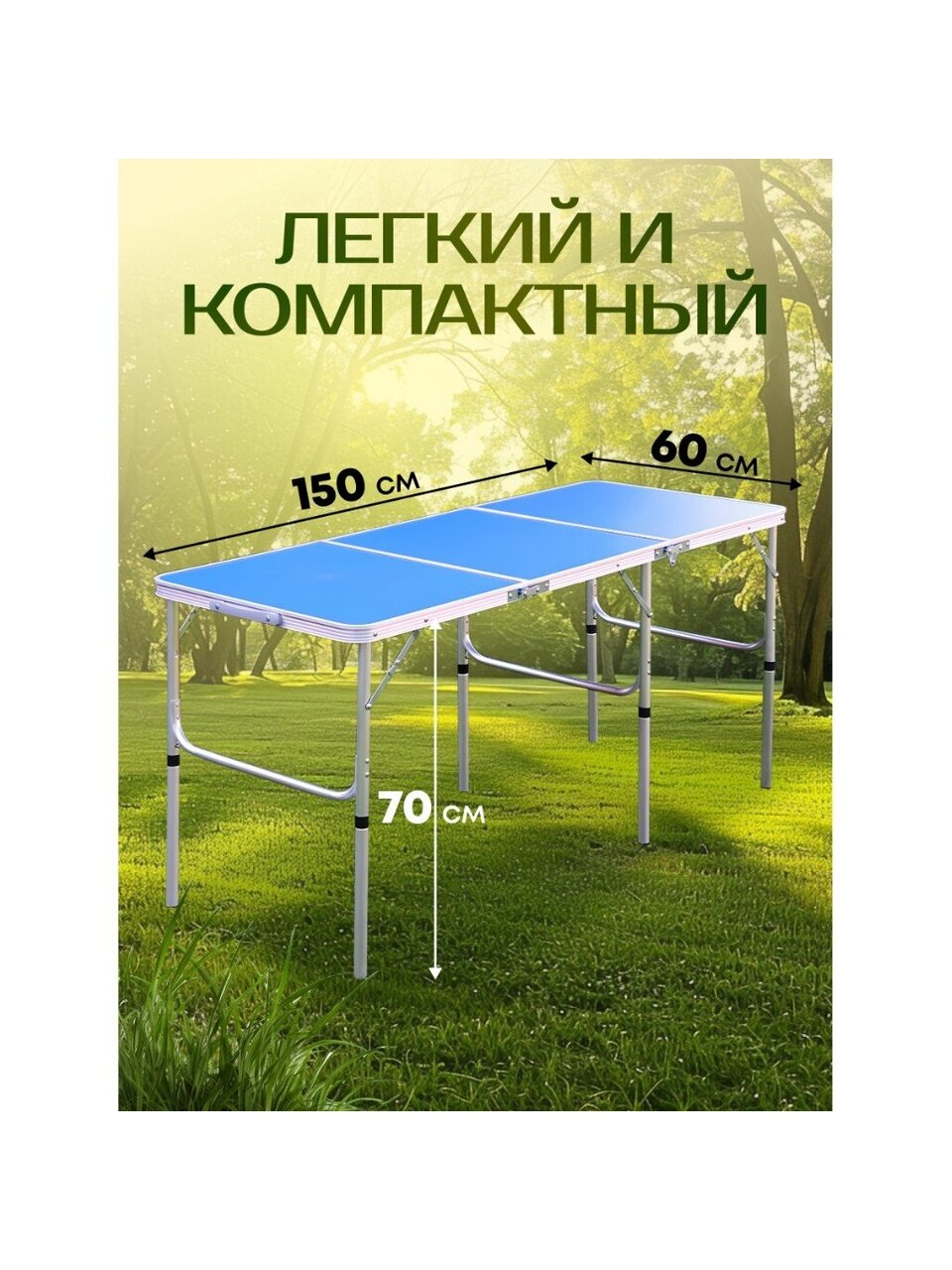 Модель имеет длину 1,5 метра, что позволит посадить за нее 6 персон. Высота стола 70 cм, ширина 60 см. Туристический стол выдерживает вес 30 кг. У стола небольшой вес 5.7 кг, что очень удобно при его переноске.