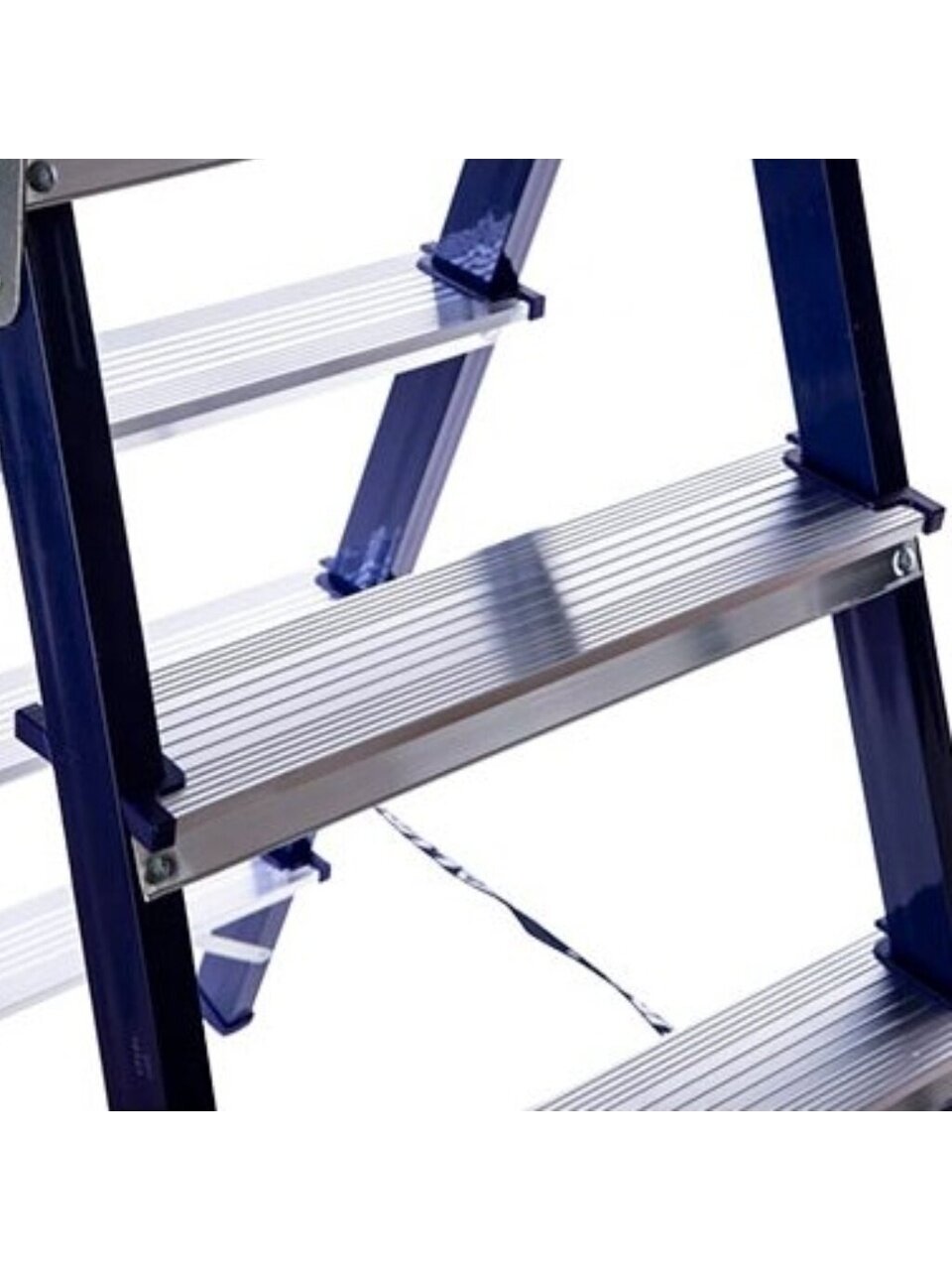 Стремянка фиксируется двумя страховочными ремнями. Тетивы стремянки изготовлены из прочного стального профиля, защищенного от коррозии эпоксидной порошковой эмалью. Ступени выполнены из высокопрочного алюминиевого профиля. Ступени имеют противоскользящую рифленую поверхность.